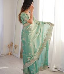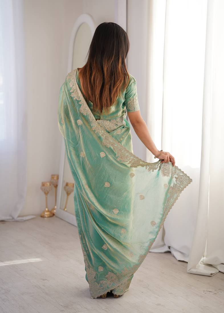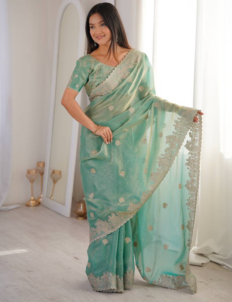 Sea green woven embroidered silk saree
