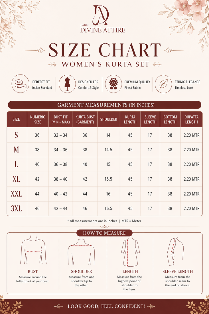 | Package Details | Kurta / 1 Bottom / 1 Dupatta | |