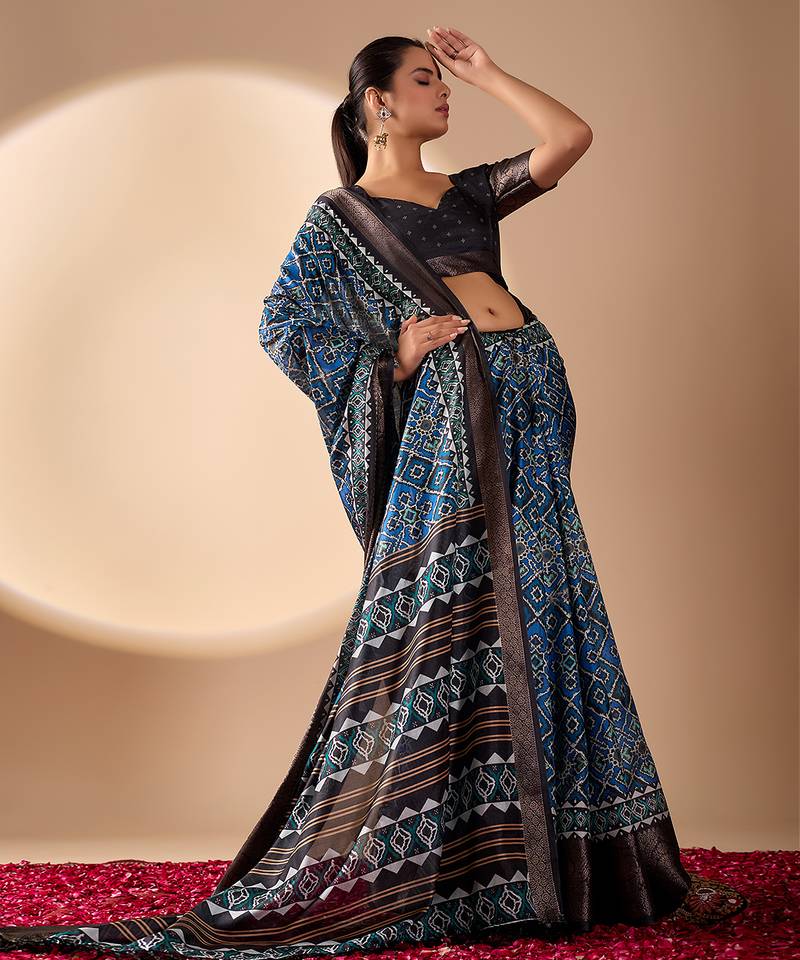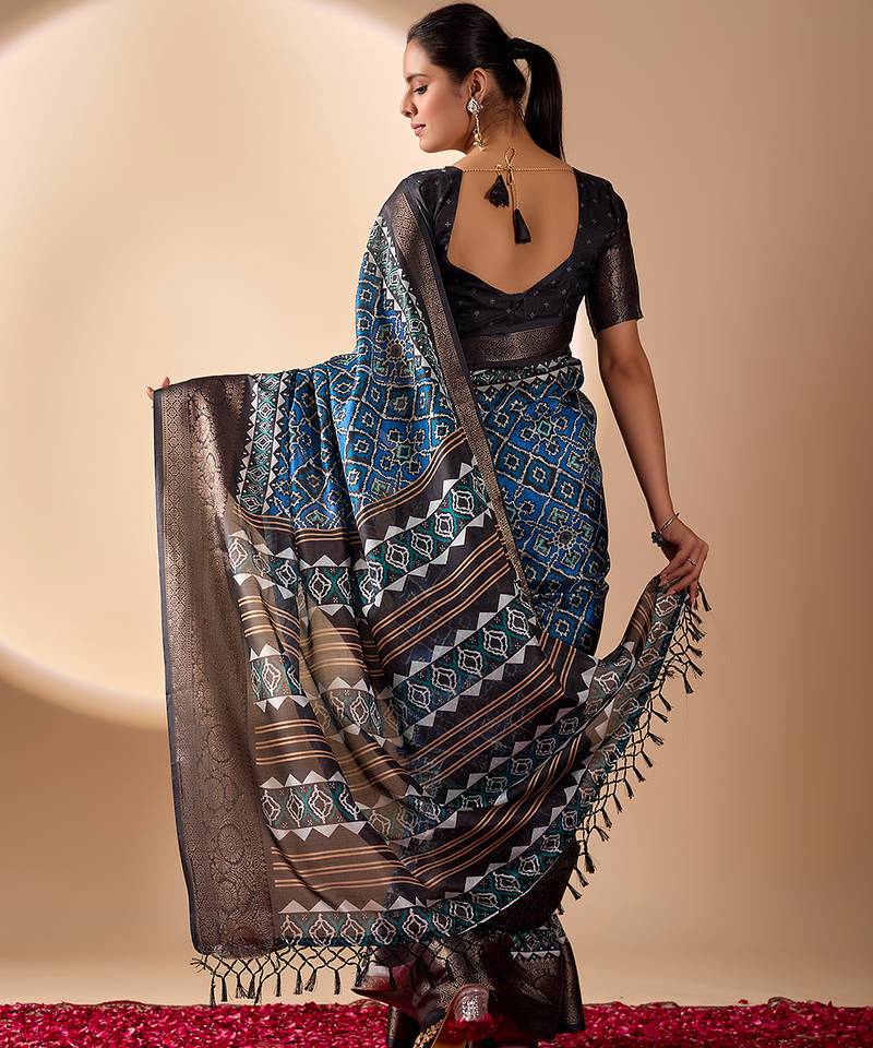 Blue soft lichi silk designer saree with digital ethnic geometric print & luxurious zari border with blouse piece