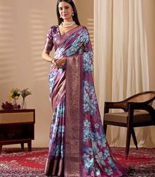 Blue soft lichi silk saree with floral prints & rich zari woven border | trendy festive wear saree with contrast blouse