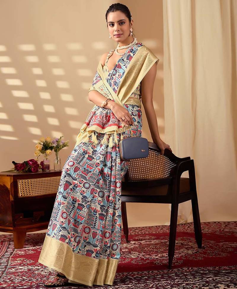 Gold toned soft lichi silk digital weaving saree with zari border | traditional banarasi silk style | with blouse