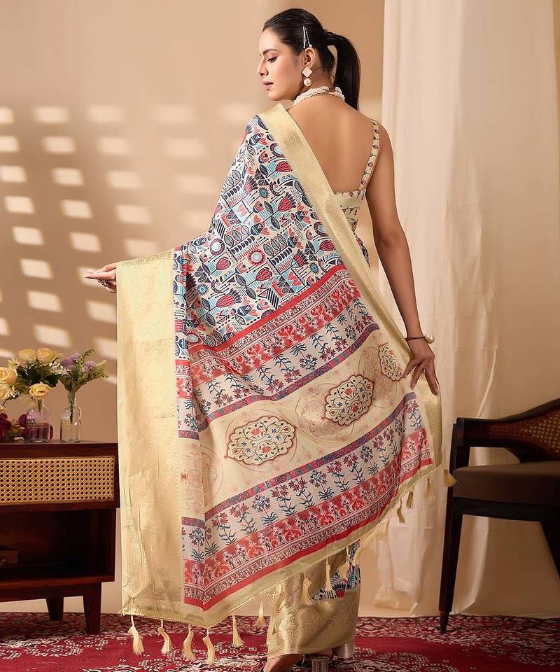 | Product Name | Gold Toned Soft Lichi Silk Digital Weaving Saree With Zari Border | Traditional Banarasi Silk Style | With Blouse | |