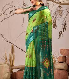 Green linen cotton saree with ikat digital print & patola inspired border | soft weaving saree with matching blouse