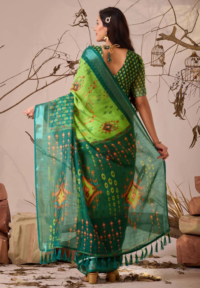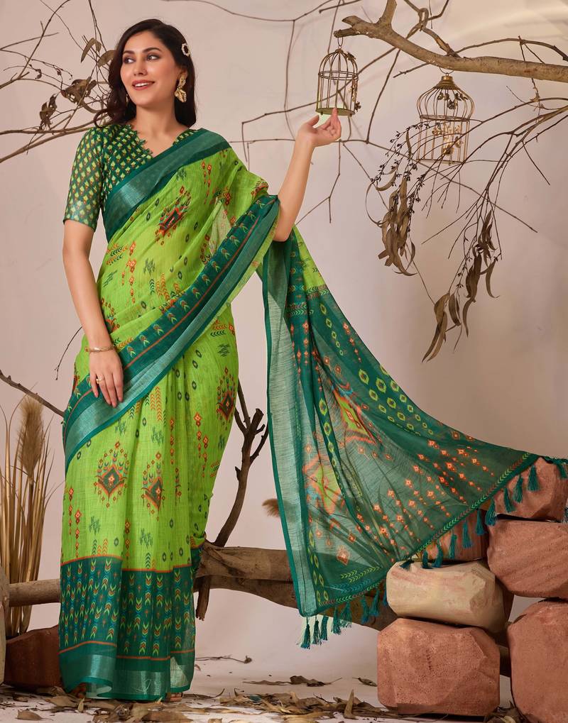 | Product Name | Green Linen Cotton Saree With Ikat Digital Print & Patola Inspired Border | Soft Weaving Saree With Matching Blouse | |