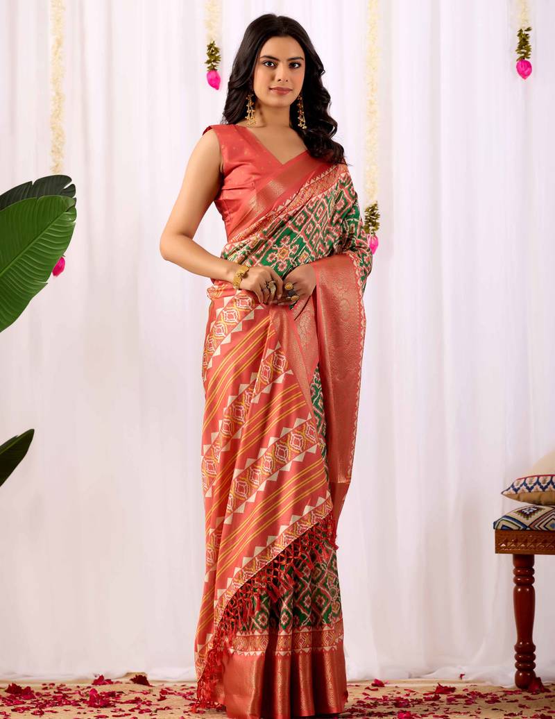 | Product Name | Green Soft Lichi Silk Patola Weaving Saree With Rich Zari Border & Contrast Blouse | |