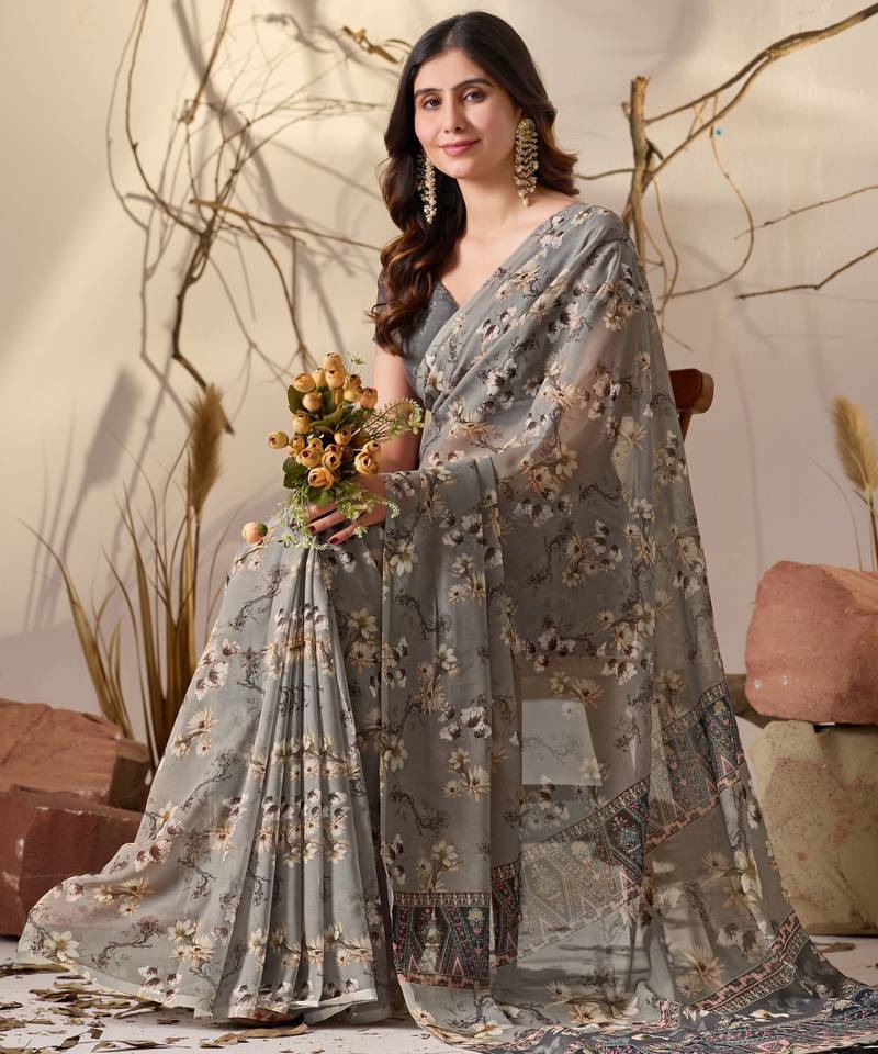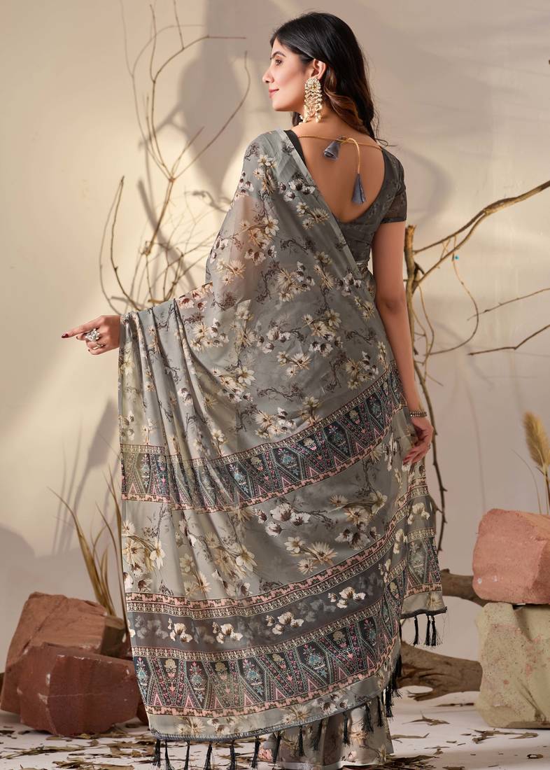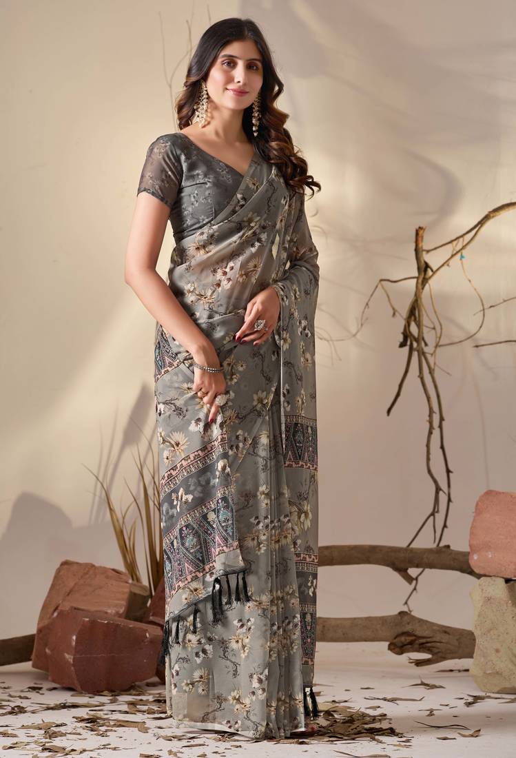 | Product Name | Grey Digital Print Georgette Saree With Tribal Pattern Pallu & Tassels – Printed Designer Saree With Blouse | |