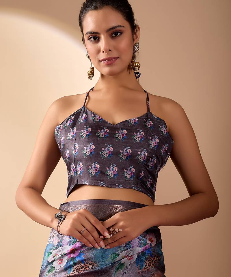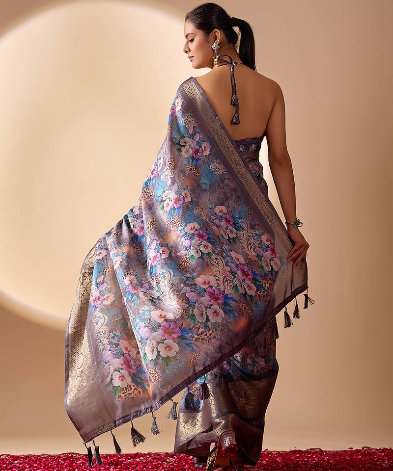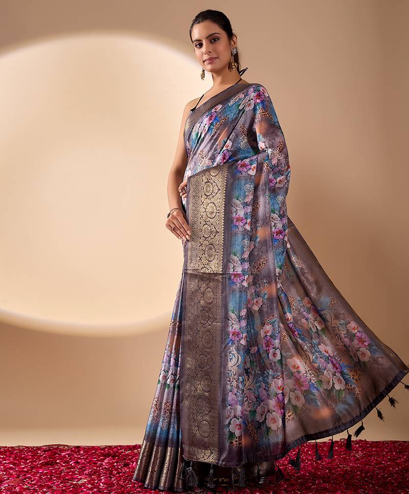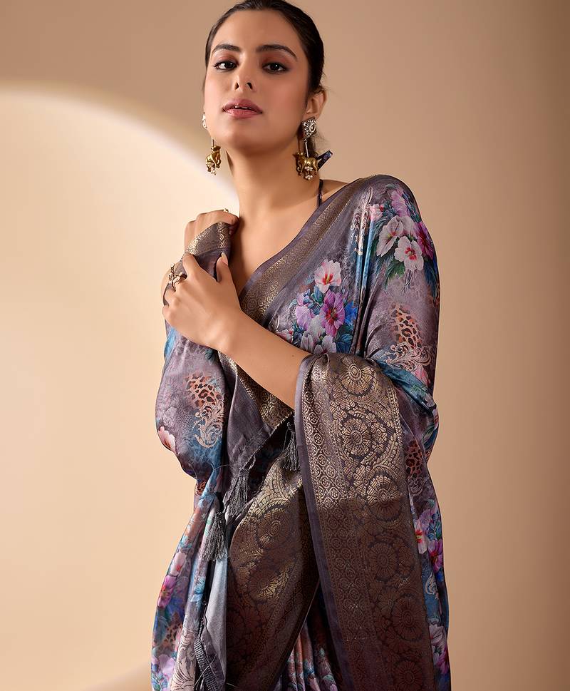 Grey lichi silk saree with digital floral print & zari woven border | designer fancy saree with contrast blouse
