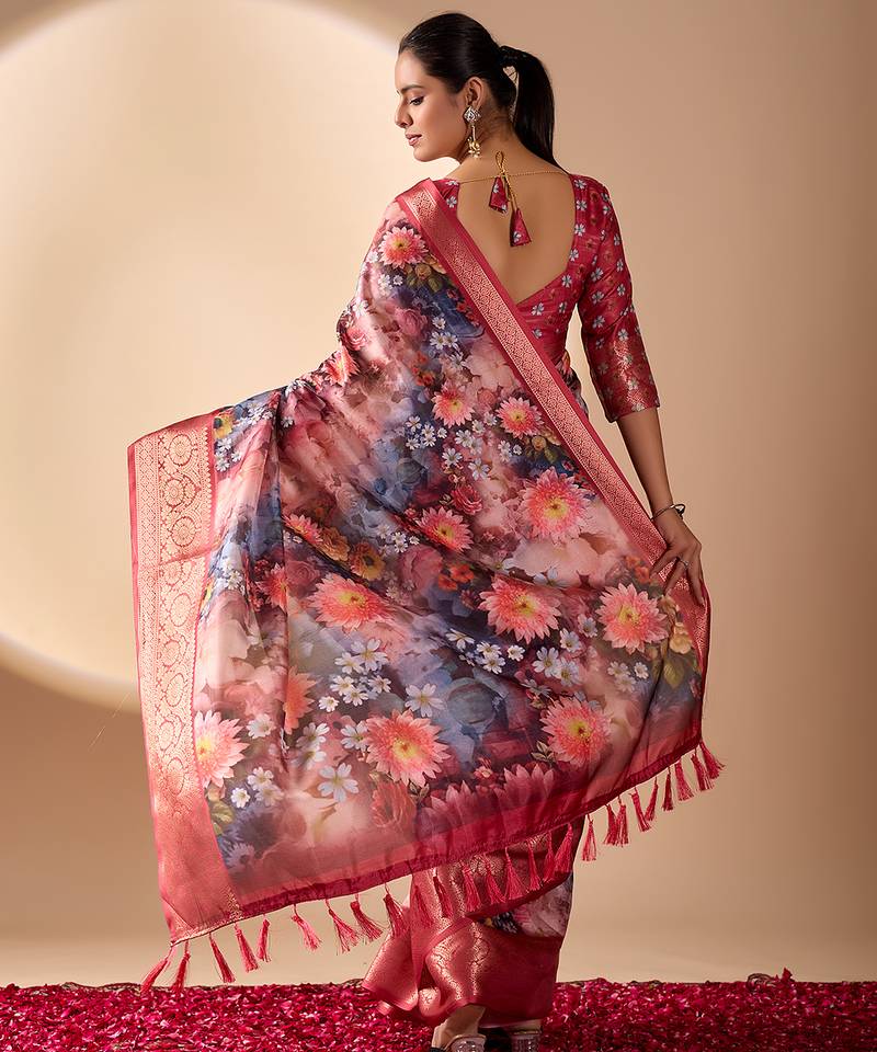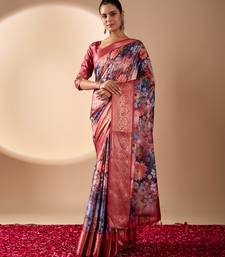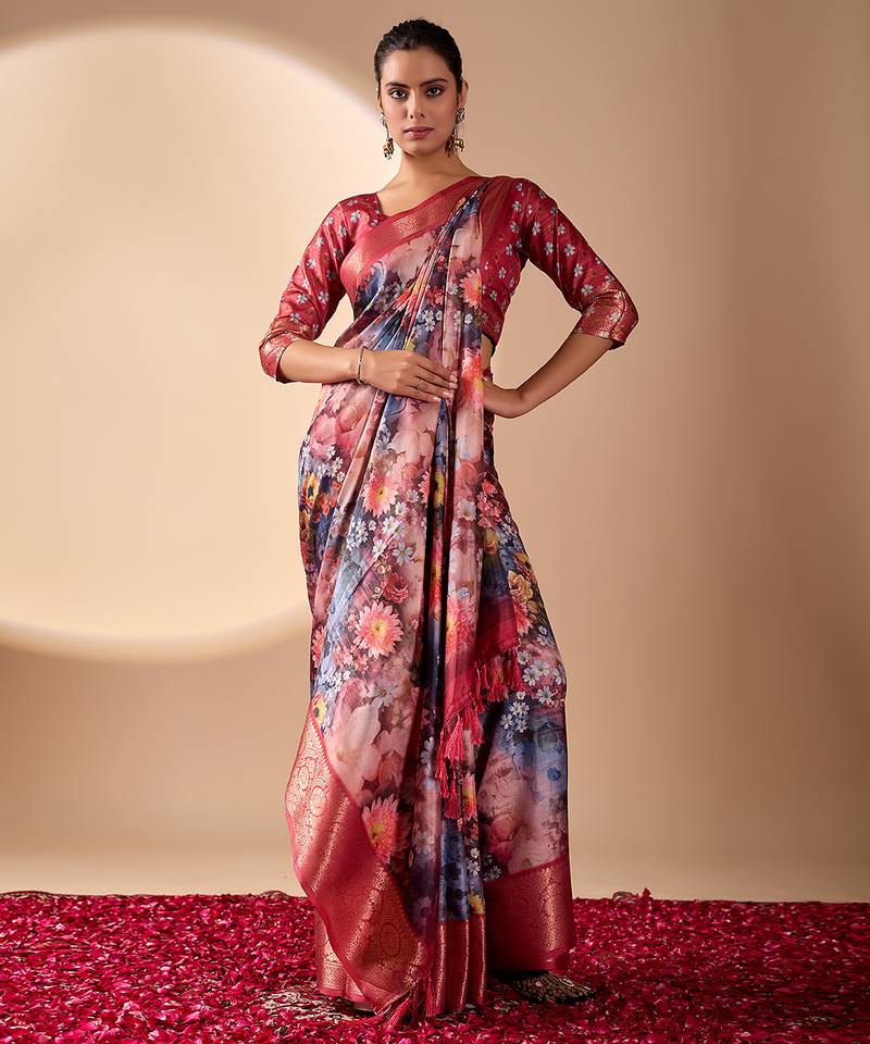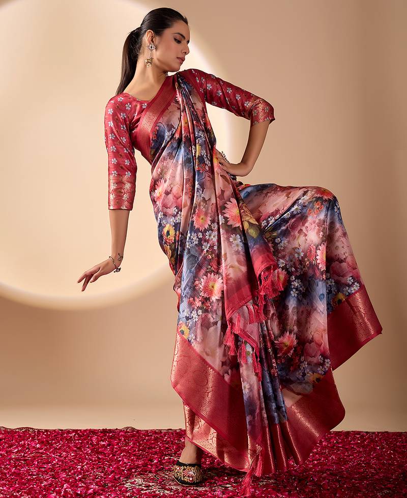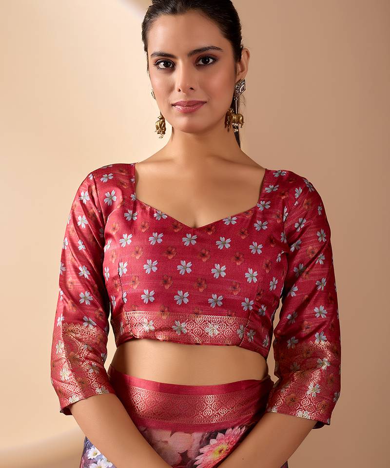 Maroon soft lichi silk floral digital print saree with zari border & designer blouse