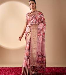 Mauve pink designer printed soft lichi silk saree with zari woven border party wear saree with blouse