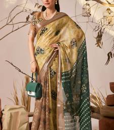 Mustard yellow linen cotton patola ikat digital print saree with contrast border & matching blouse