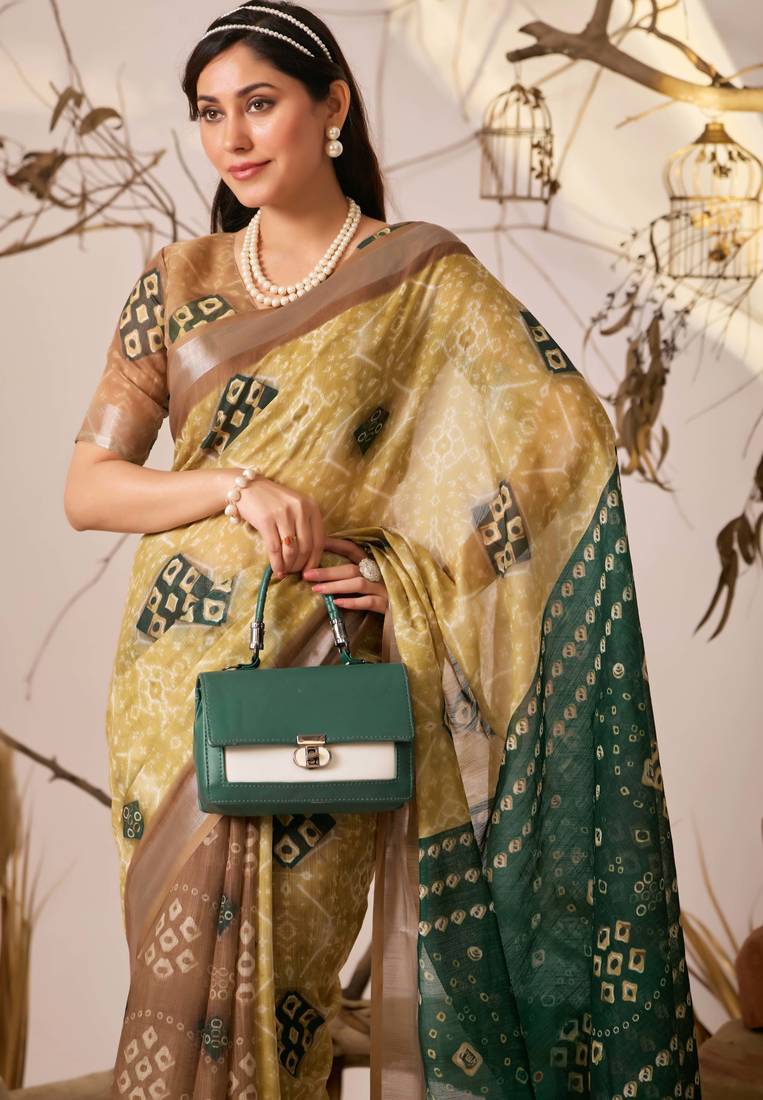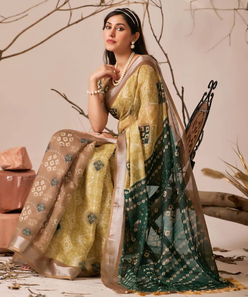 | Product Name | Mustard Yellow Linen Cotton Patola Ikat Digital Print Saree With Contrast Border & Matching Blouse | |