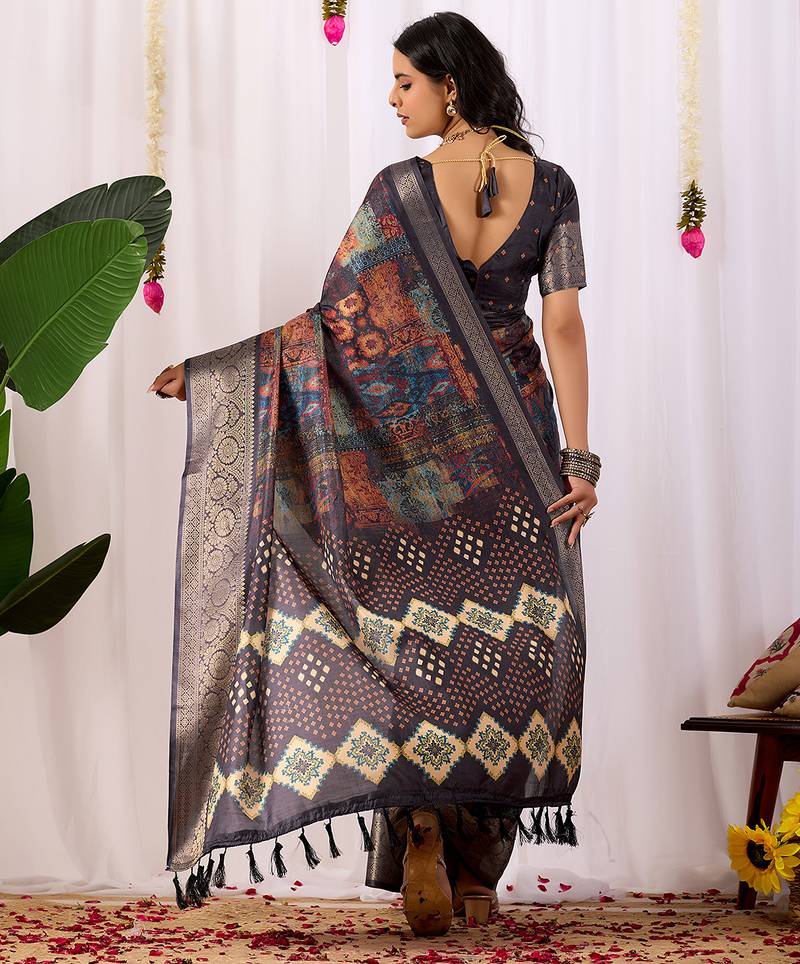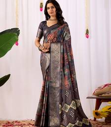 Navy blue soft lichi silk saree with digital ethnic print & rich zari border | traditional designer saree with blouse