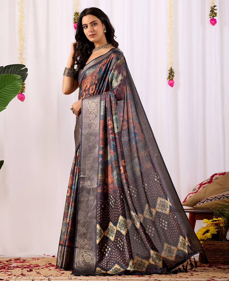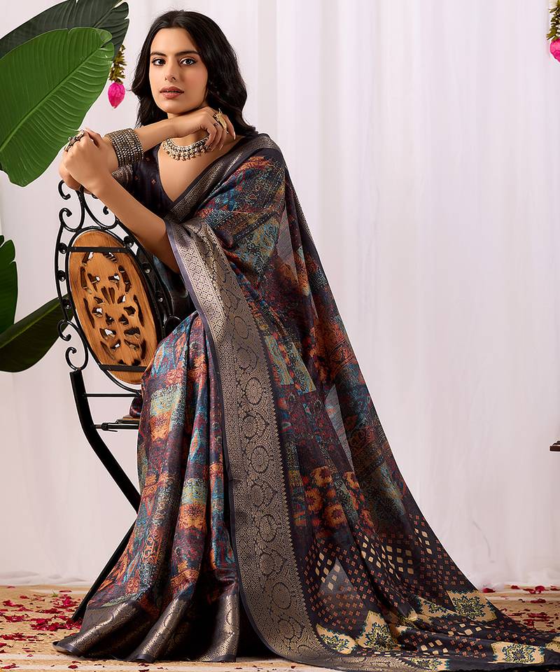 | Product Name | Navy Blue Soft Lichi Silk Saree With Digital Ethnic Print & Rich Zari Border | Traditional Designer Saree With Blouse | |