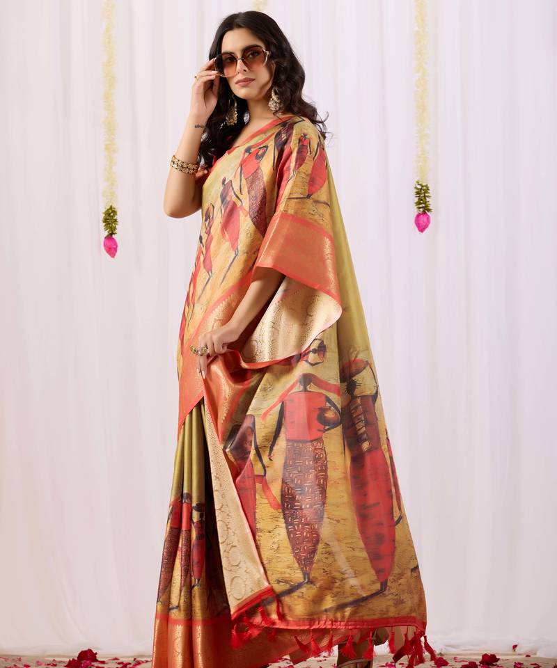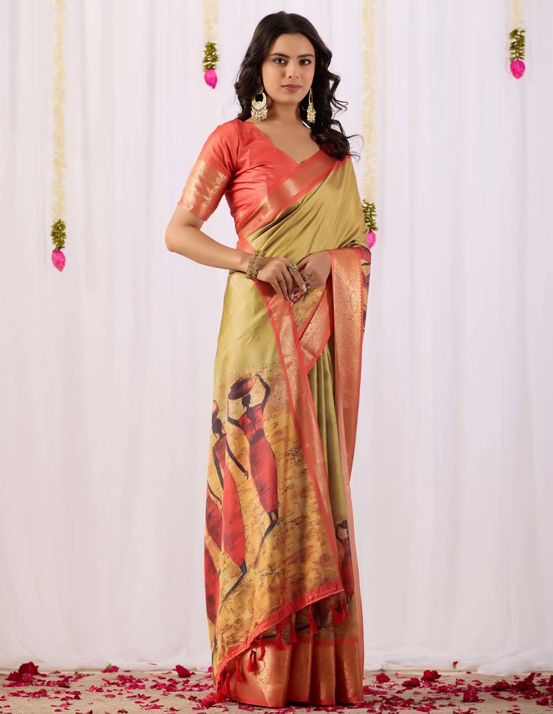 Olive printed soft lichi silk saree with zari weaving border | traditional designer saree with blouse