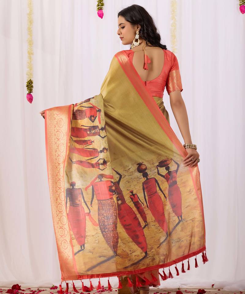 | Product Description | Premium Soft Lichi Silk Saree Featuring Elegant Tribal Artwork And A Rich Woven Border For A Festive Ready Look.