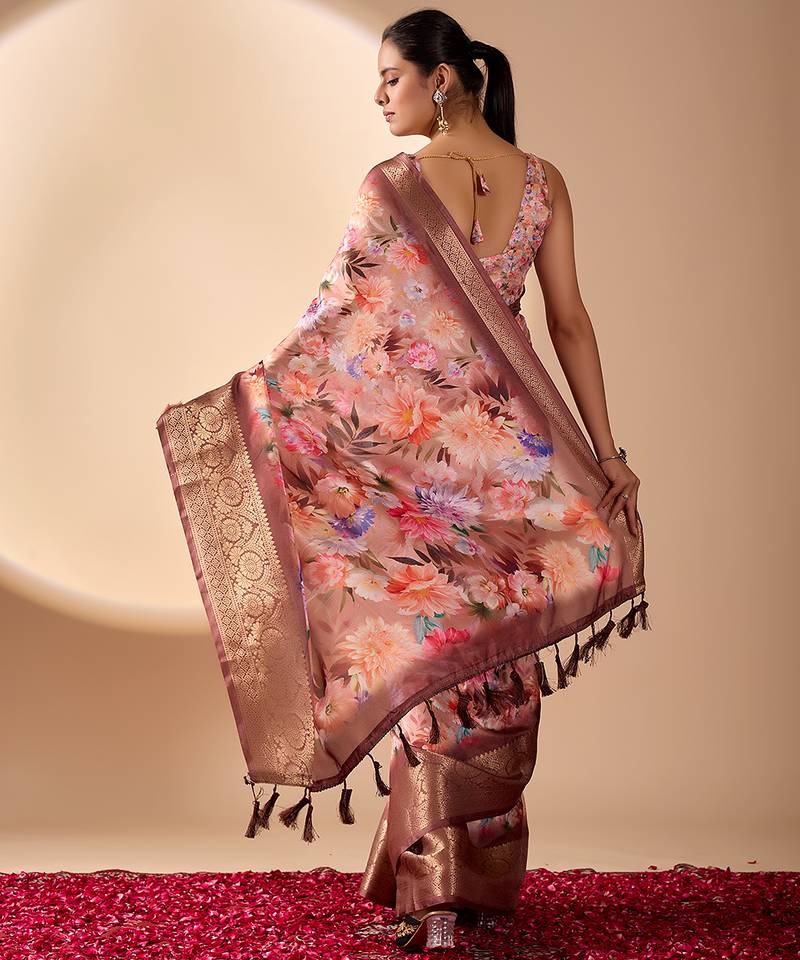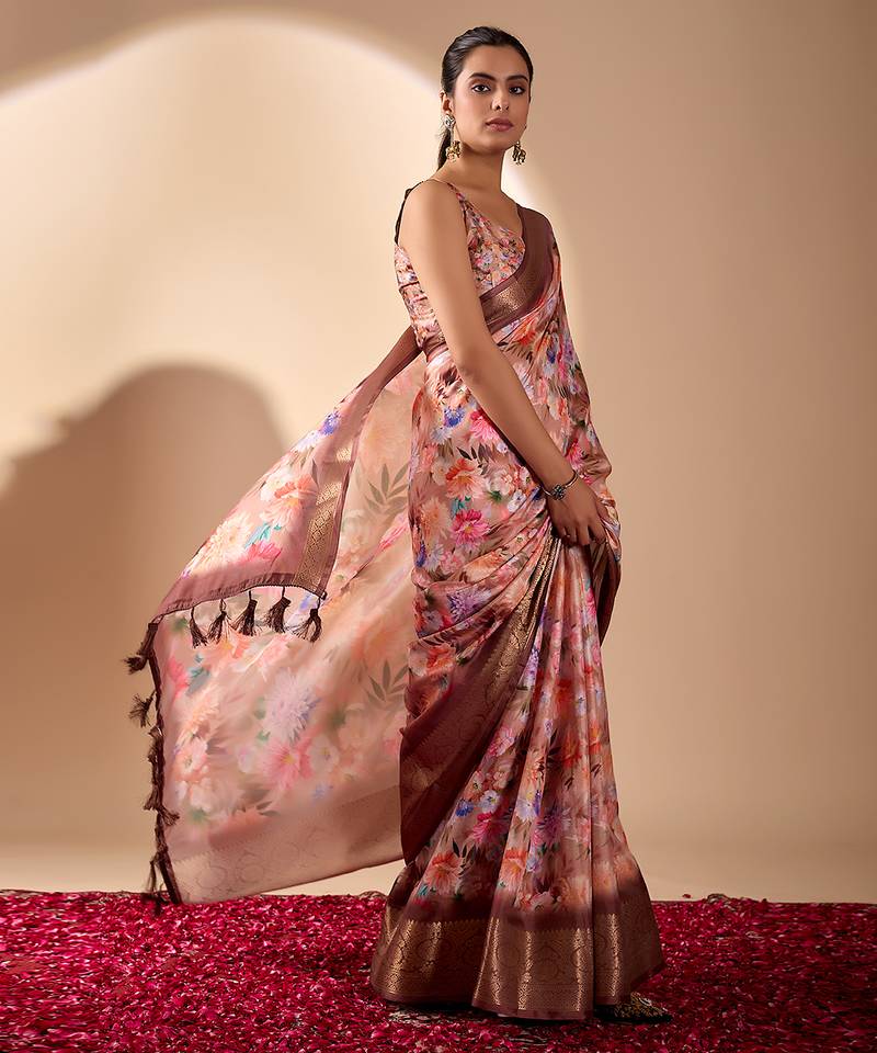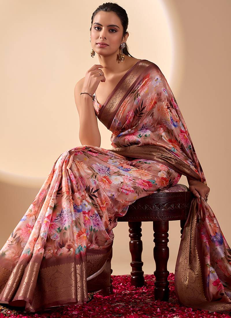 Peach designer soft lichi silk saree with floral digital print & rich zari border | party & festive wear with blouse