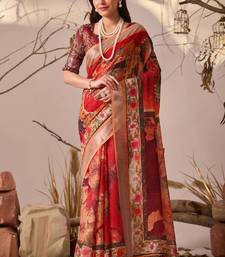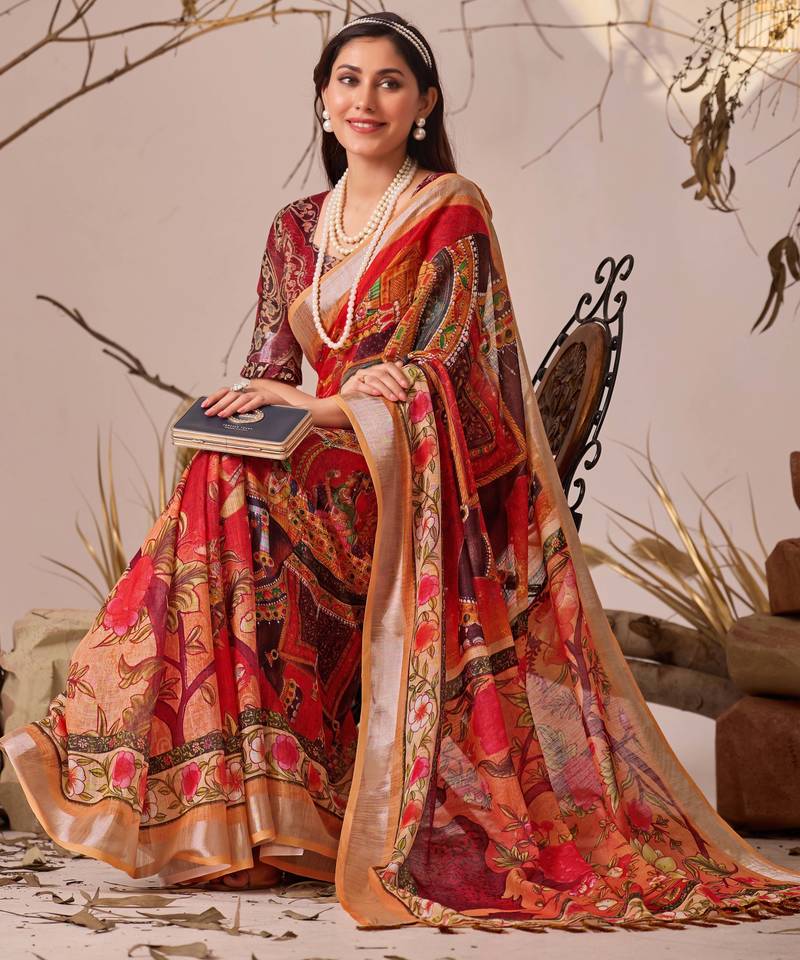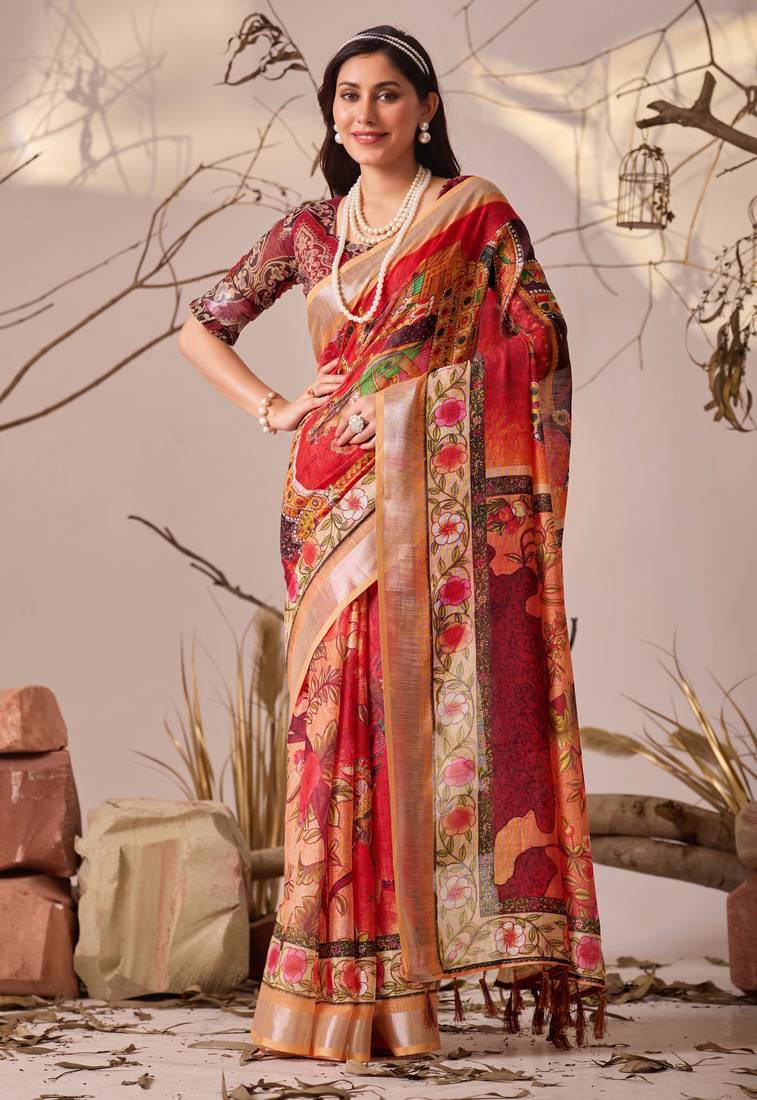 | Product Name | Red Linen Cotton Saree With Digital Floral & Artistic Print And Patola Style Contrast Border With Matching Blouse | |