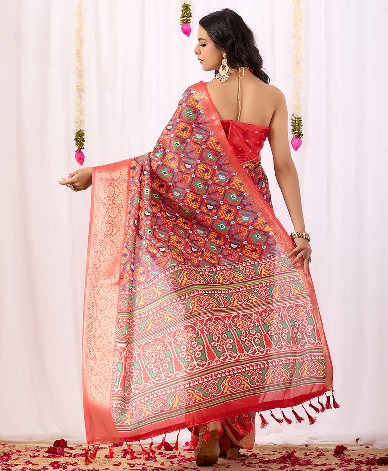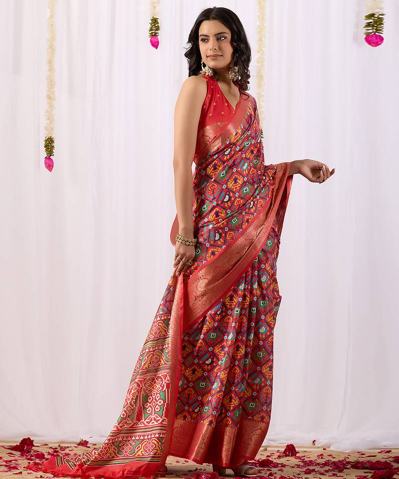 Red patola weaving lichi silk saree with broad border | hand-woven traditional patola saree with matching blouse
