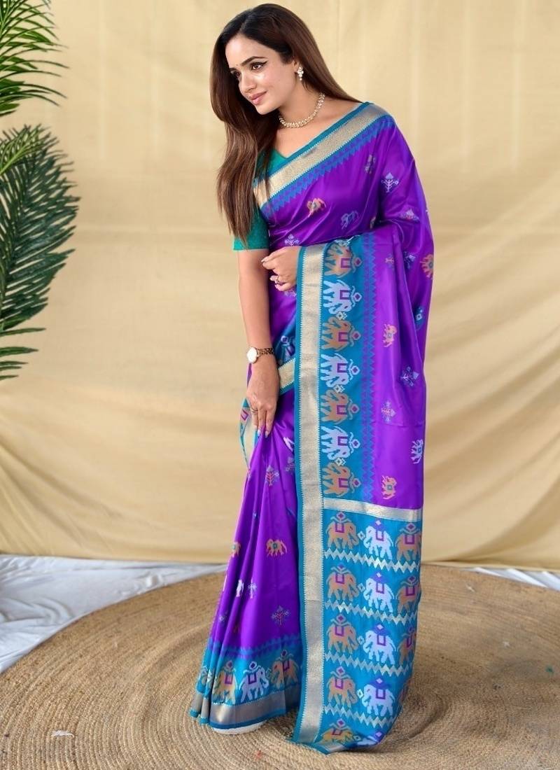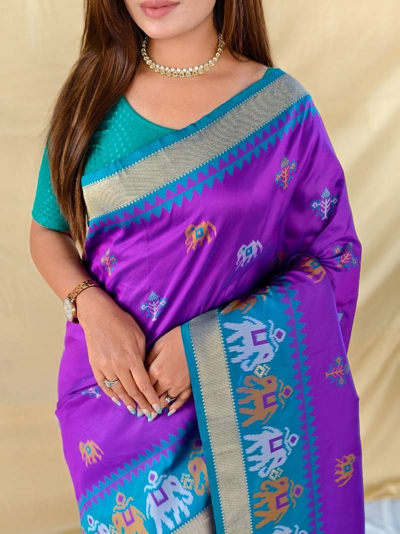 | Product Description | This Elegant Soft Silk Saree Features A Soft Purple Base Adorned With Delicate Elephant Weaved Butti Mottifs , Beautifully Complemented By A Vibrant Elegant Pallu. The Richly Illustrated Pallu Highlights Traditional Elephant With Golden Strips, Adding A Graceful Statement |