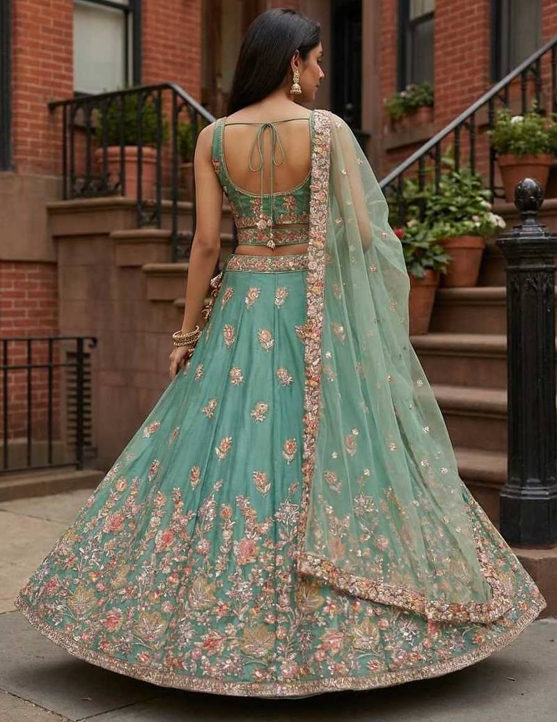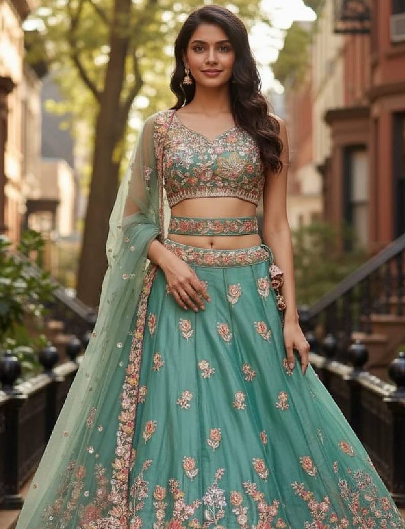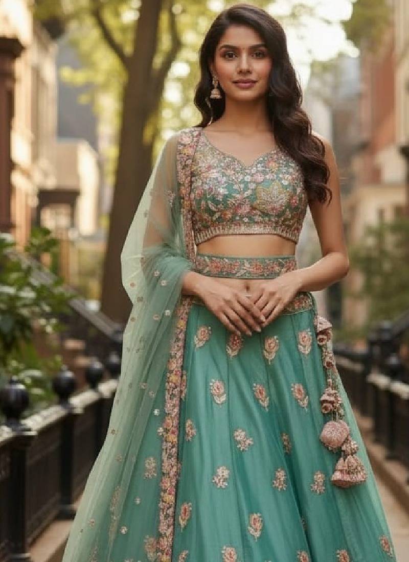 | Product Name | Engaging Sea Green Zari And Sequins, And Thread Embroidered Fendy Silk Indian Wedding Designer Lehenga Choli | |