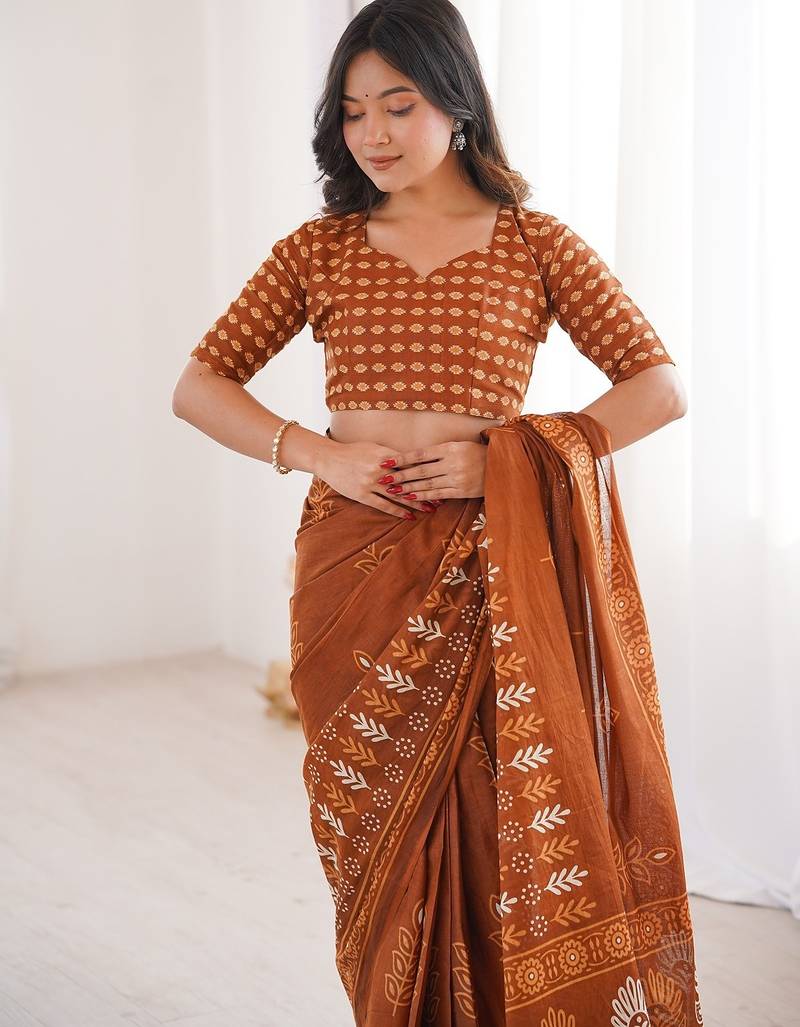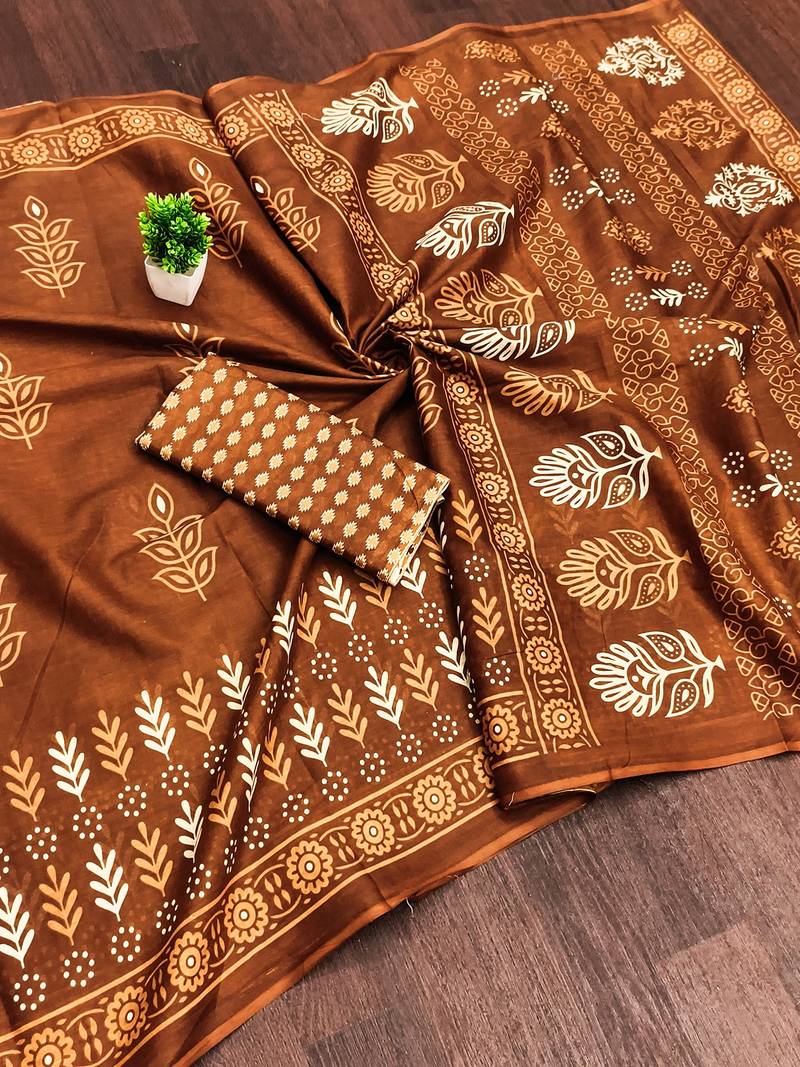 Pure Cotton Saree & Blouse Fabric. Saree & Blouse Both Are Printed Design.