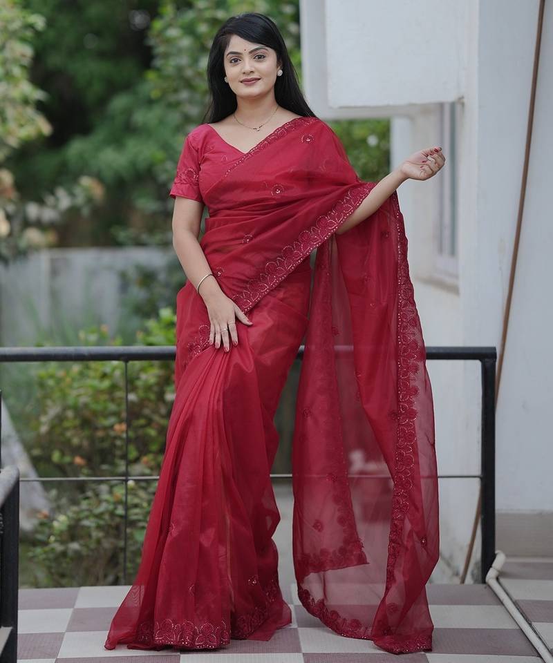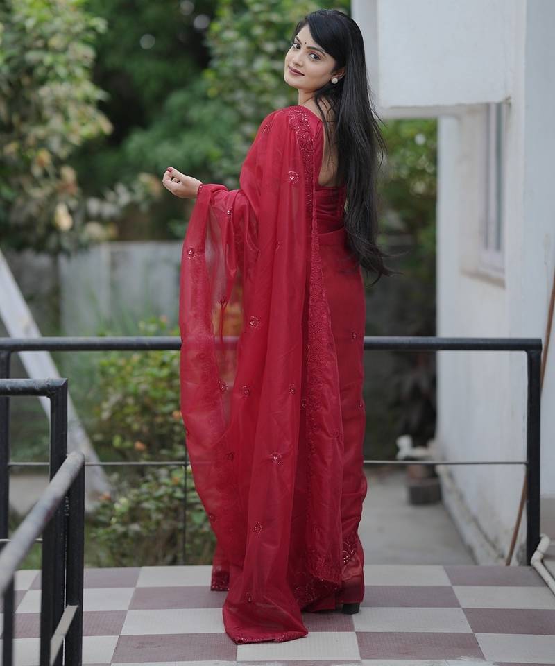 Red embroidered blouse with embroidered saree