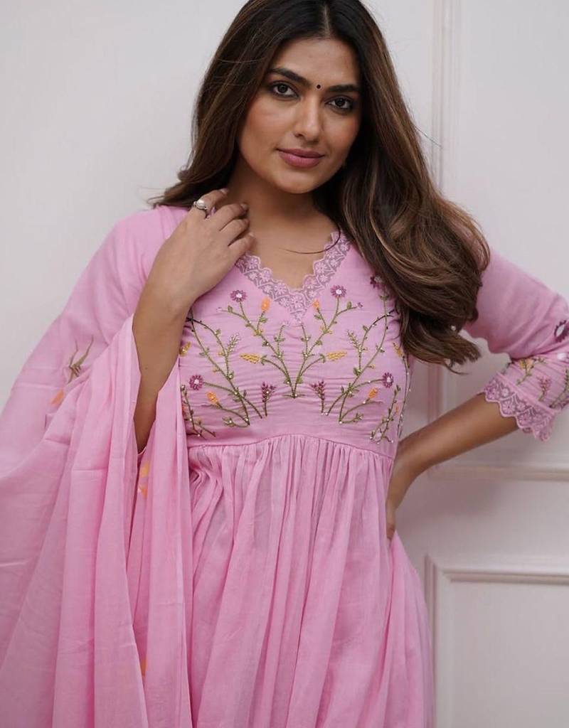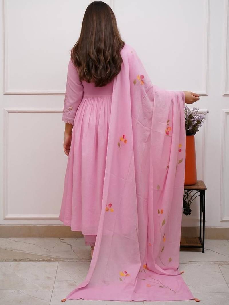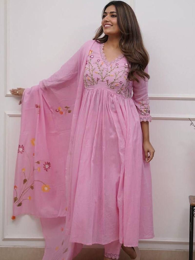 | Product Description | Add A Touch Of Soft Elegance To Your Ethnic Collection With This Beautiful Pink Rayon Anarkali Suit Set. Crafted From Lightweight And Breathable Rayon Fabric, The Anarkali Features A Flowy Silhouette That Enhances Movement While Offering All Day Comfort. The Bodice Is Adorned With Delicate Floral Embroidery That Adds A Graceful And Feminine Charm, While The Gathered Flare Creates A Flattering And Timeless Look. Intricate Detailing On The Neckline And Sleeves Further Elevates The Overall Design With Subtle Sophistication. Paired With Matching Pants And A Coordinated Dupatta Featuring Minimal Prints, This Three Piece Set Offers A Balanced Blend Of Simplicity And Style. The Soothing Pink Hue Makes It Perfect For Daytime Celebrations, Festive Occasions, And Intimate Gatherings. Elegant, Airy, And Effortlessly Stylish, This Anarkali Suit Is Ideal For Those Who Appreciate Classic Ethnic Wear With A Modern, Refined Appeal. |