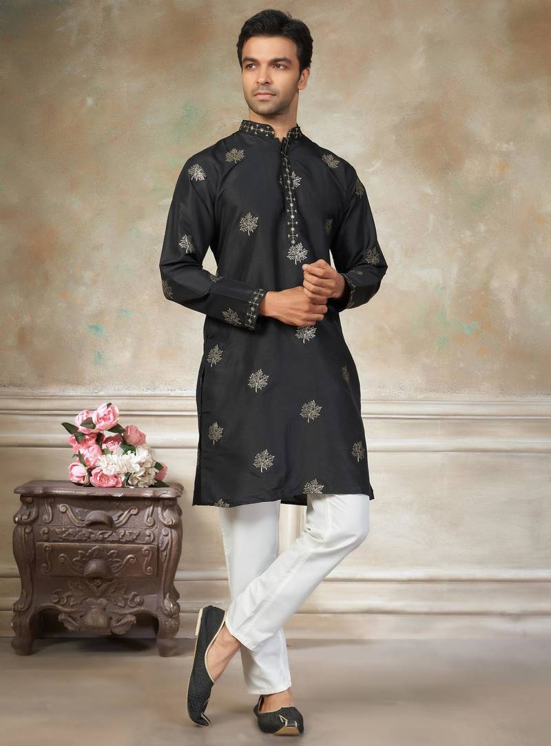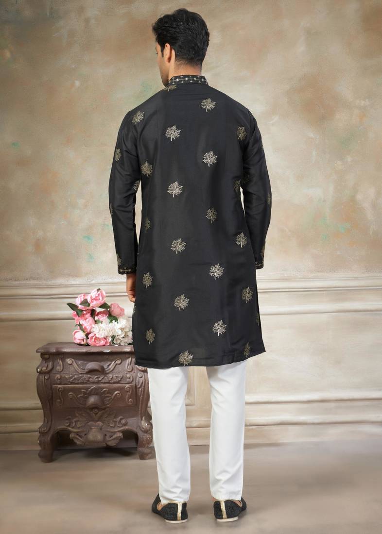 Black pure silk kurta pajama with embroidered work