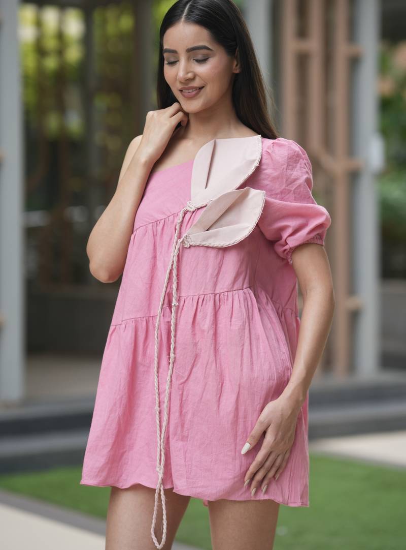 | Product Description | Baby Pink Layered Pure Cotton One Shoulder Mini Dress With Peach 3 D Floral Work And Matching Shorts Best For Resort Wears, Summers And Beach Vibes |