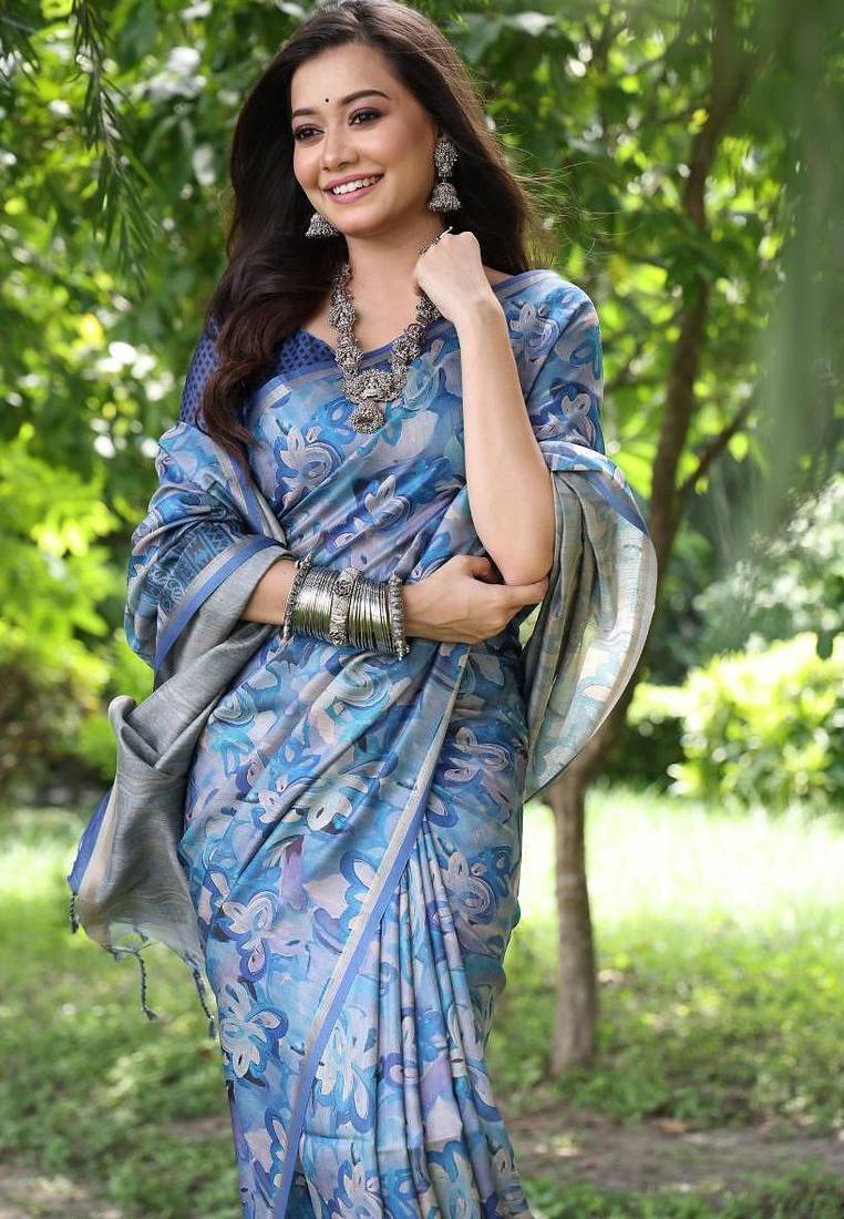 | Product Name | Blue Color Tussar Silk Unique Print Zari Weaving Border Saree | |