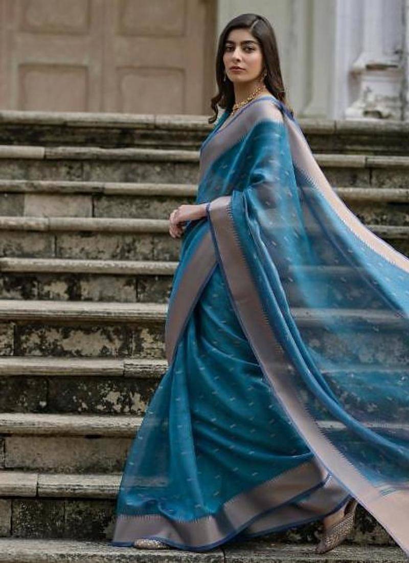 Firozi color kalyani silk zari weaving butti & border saree