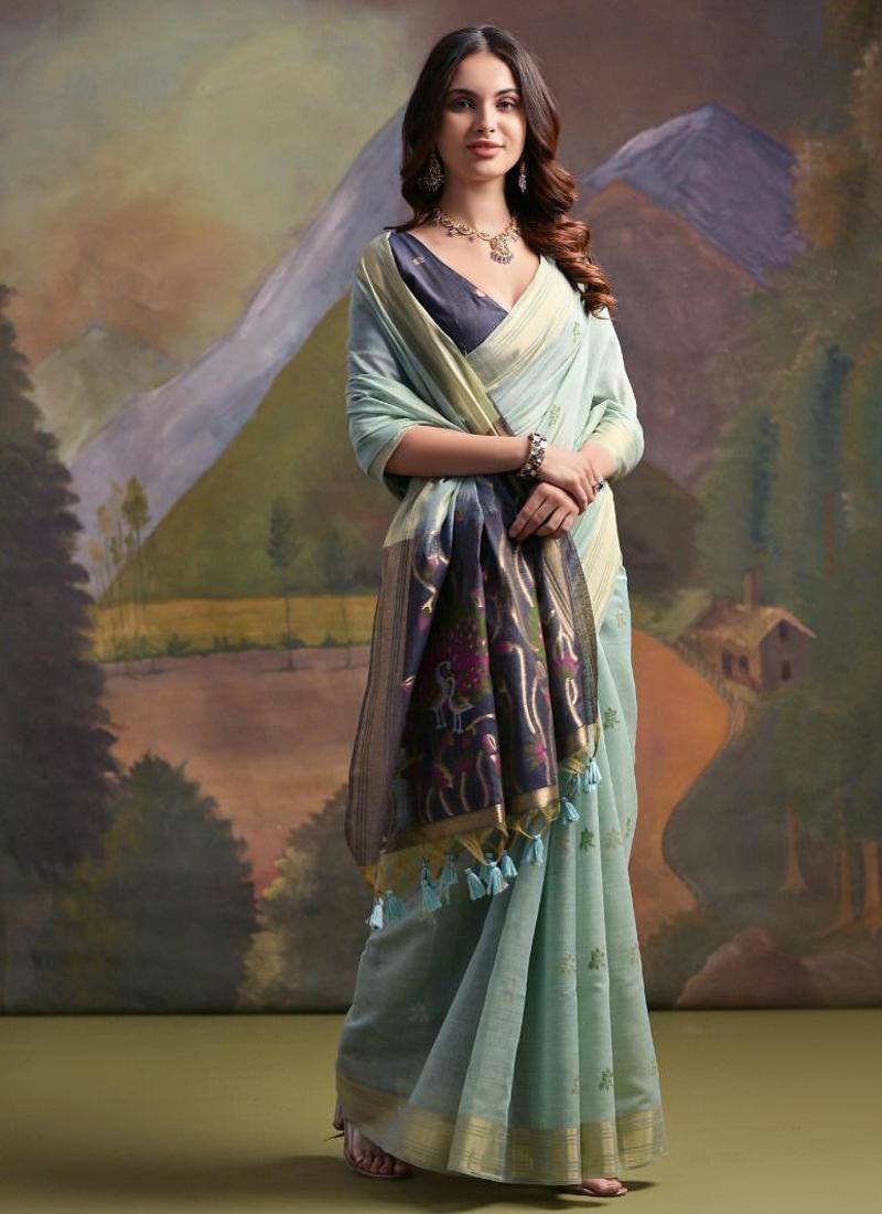 Firozi color muga cotton colorfull resham weaving saree