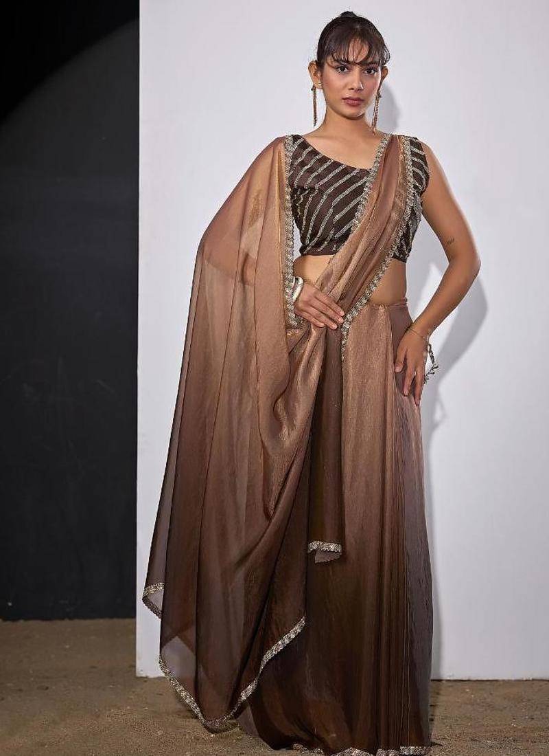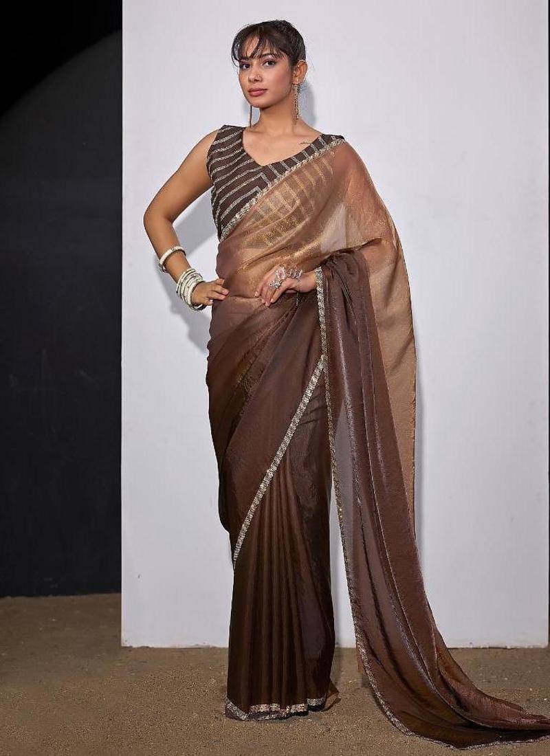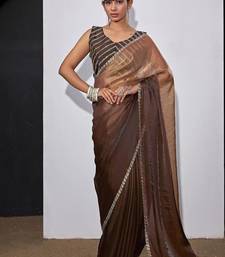 Gold & brown color fendi satin silk peding zircon handwork saree