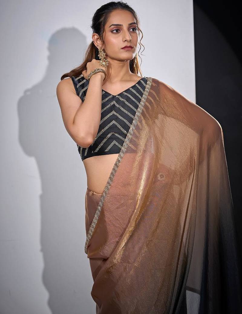 Gold & darkgrey color fendi satin silk peding zircon handwork saree