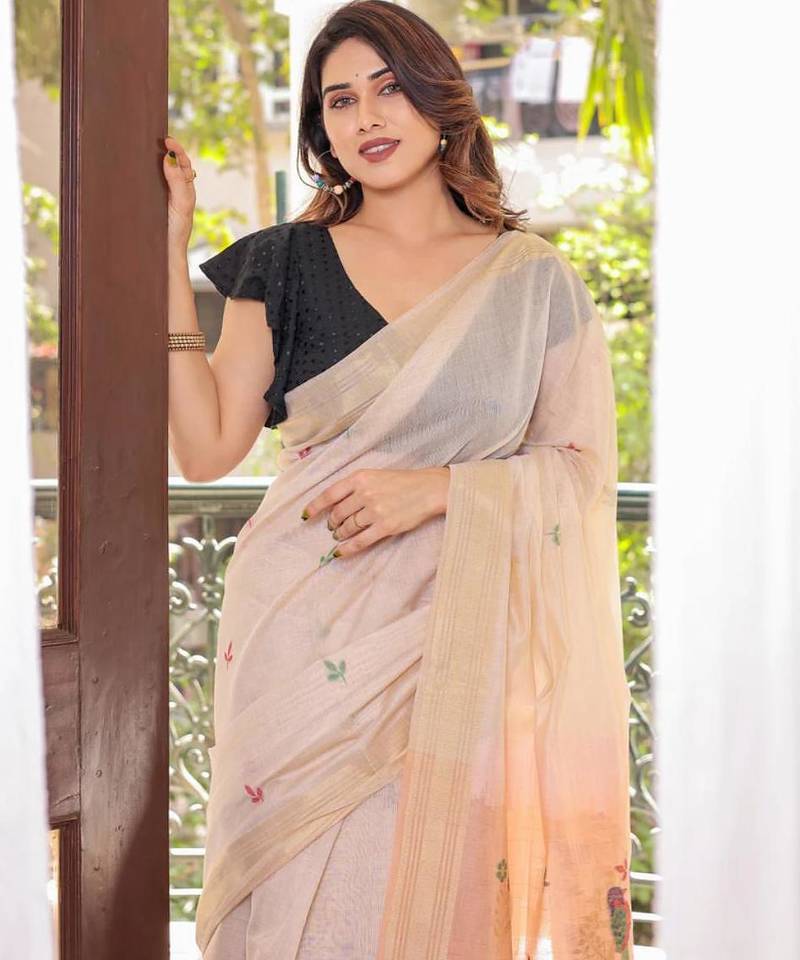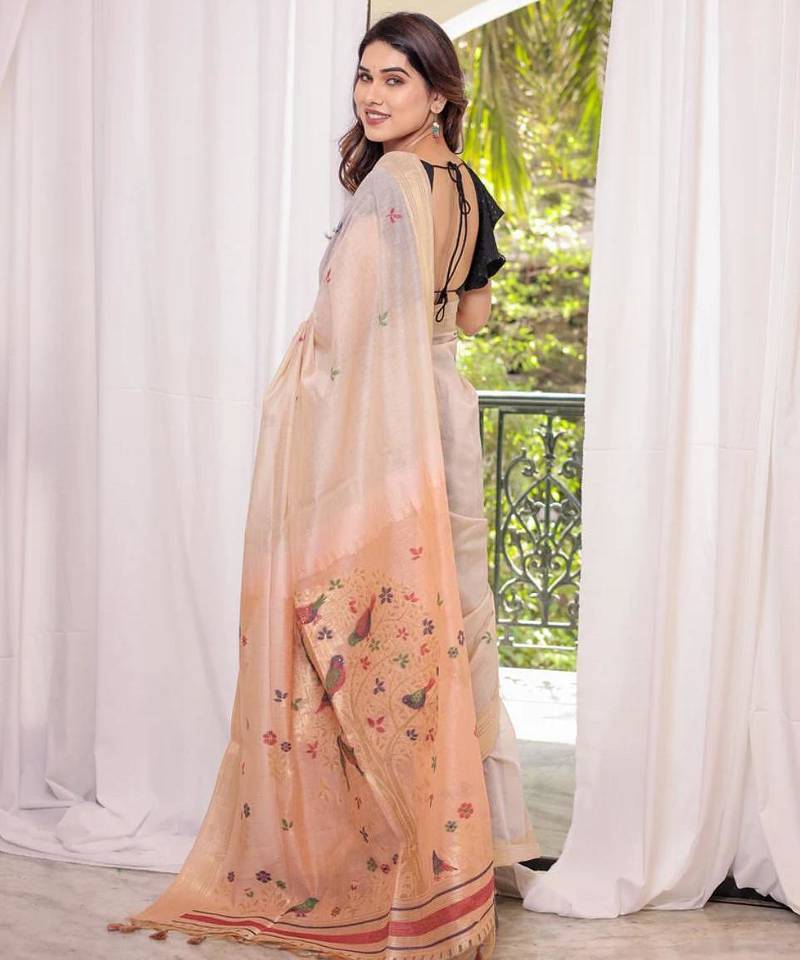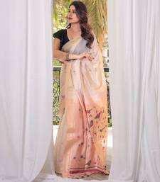 Off-white & peach color muga cotton resham weaving saree