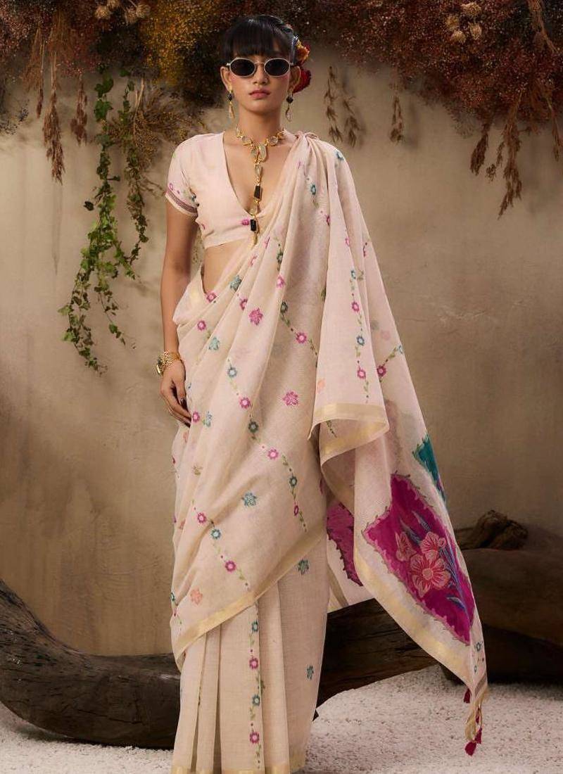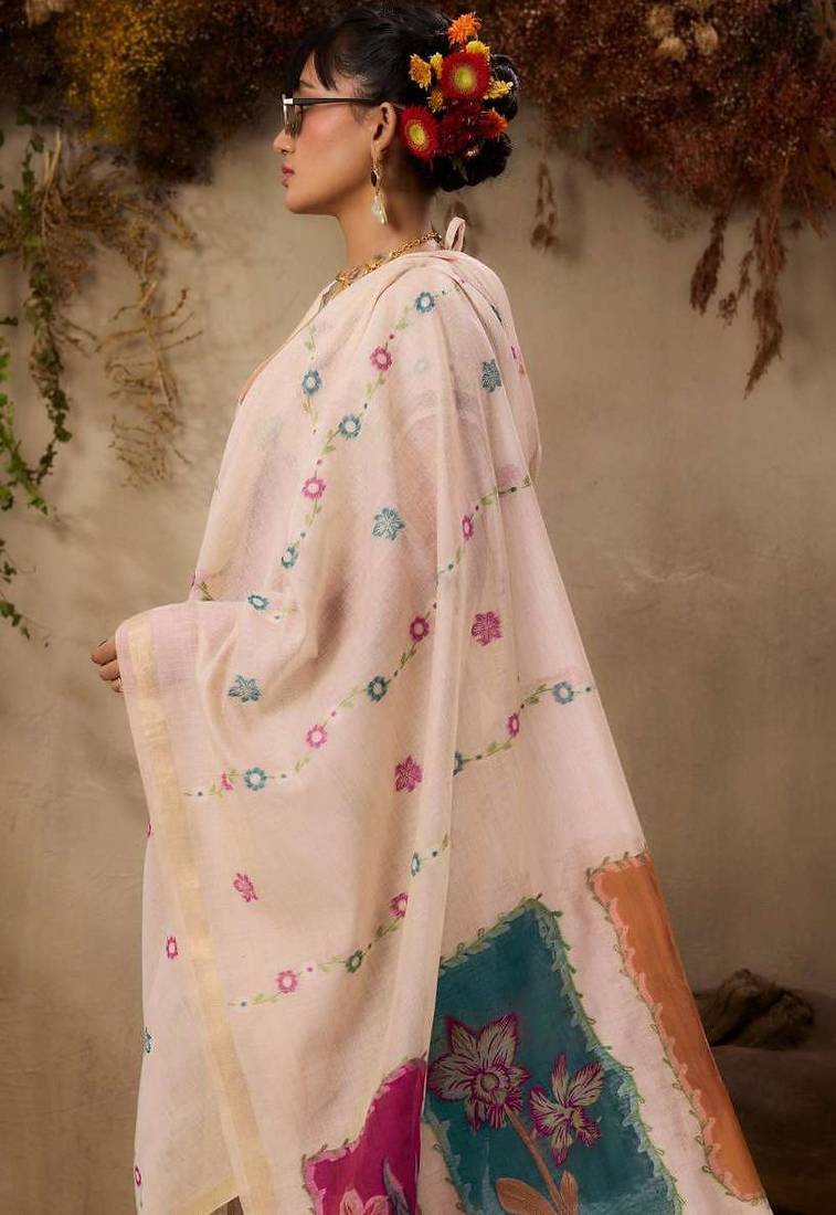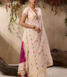 Off-white & pink color muga cotton colorfull resham weaving saree