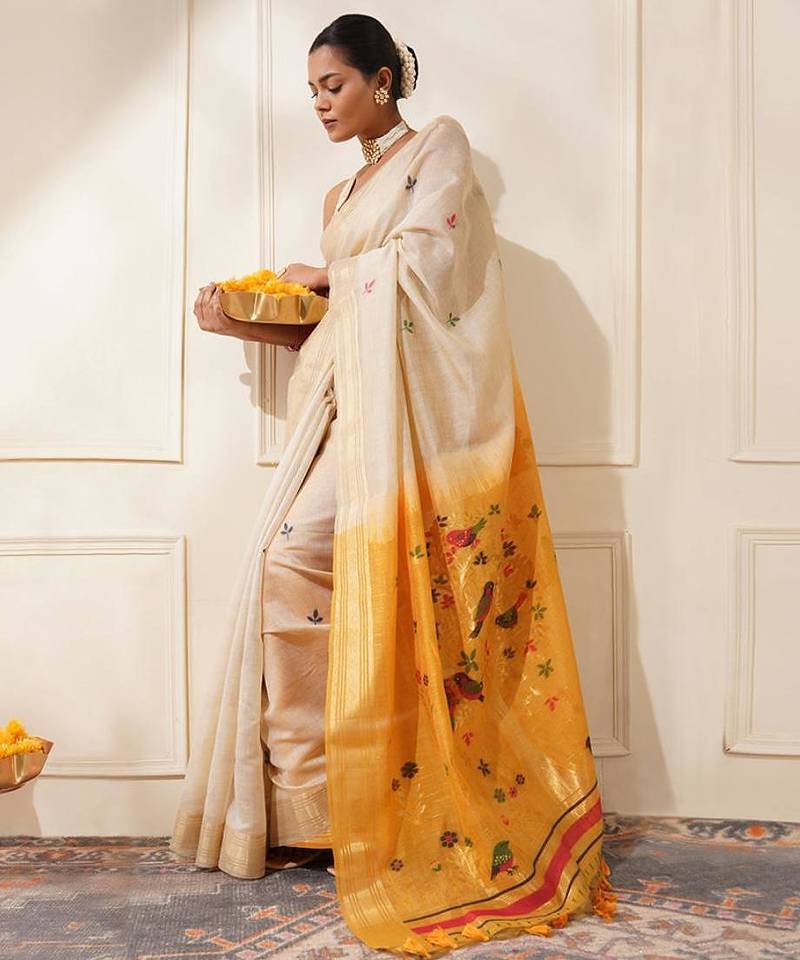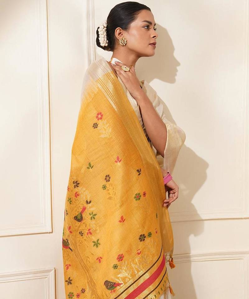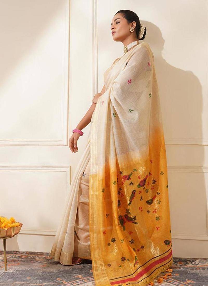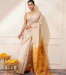 Off-white & yellow color muga cotton resham weaving saree