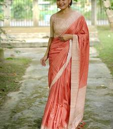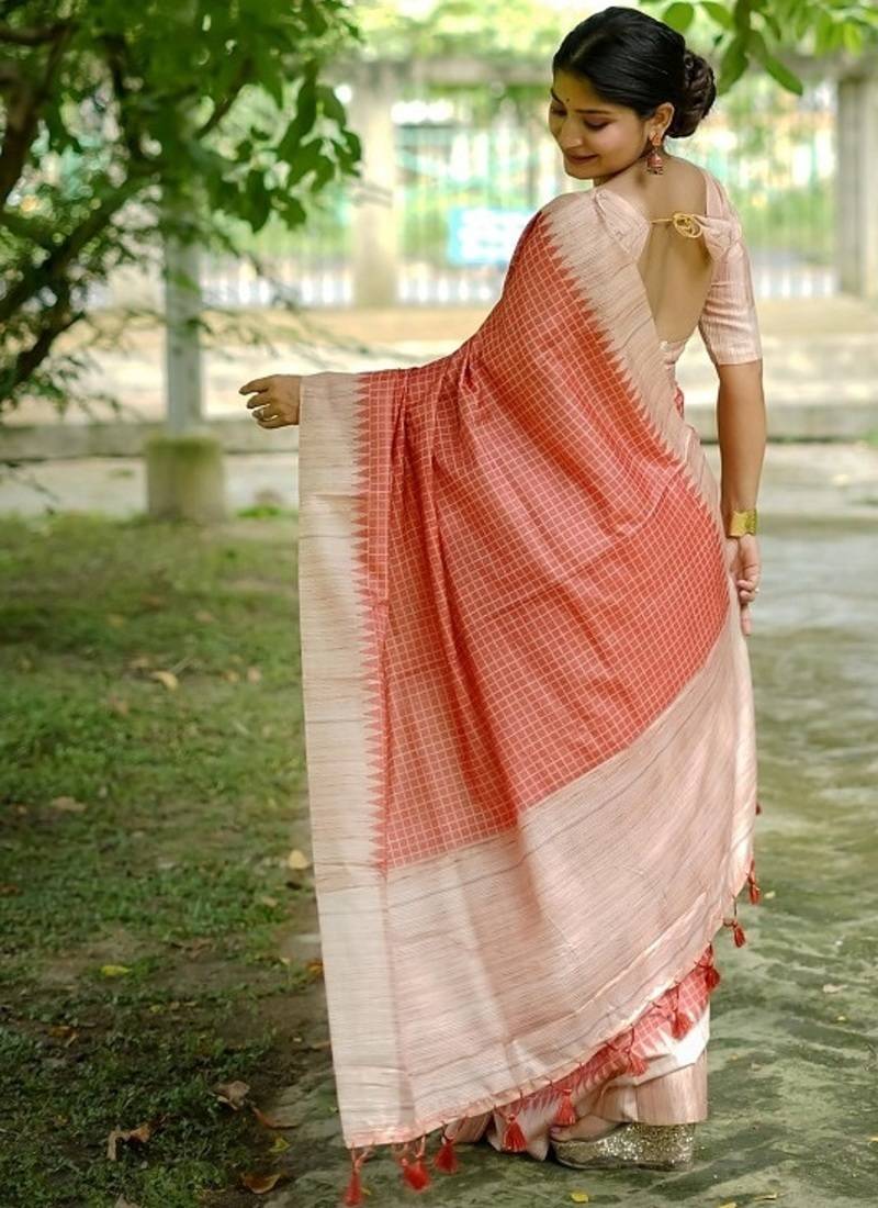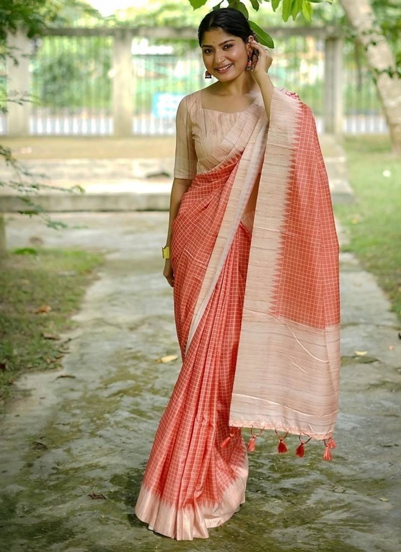 | Product Name | Orange Color Tussar Silk Checks Printed Style Kanth Weaving Saree | |