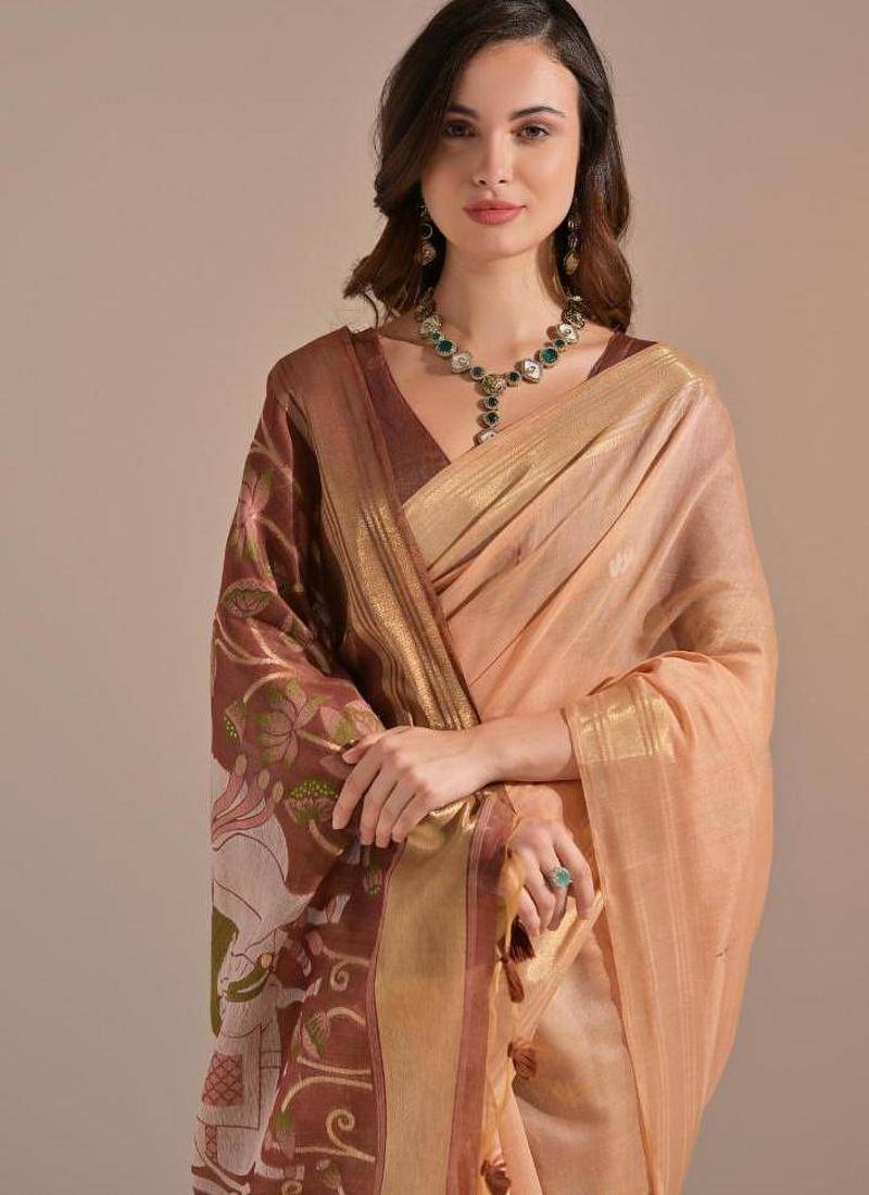 | • | Saree | : | Color- Peach / Fabric- Cotton |