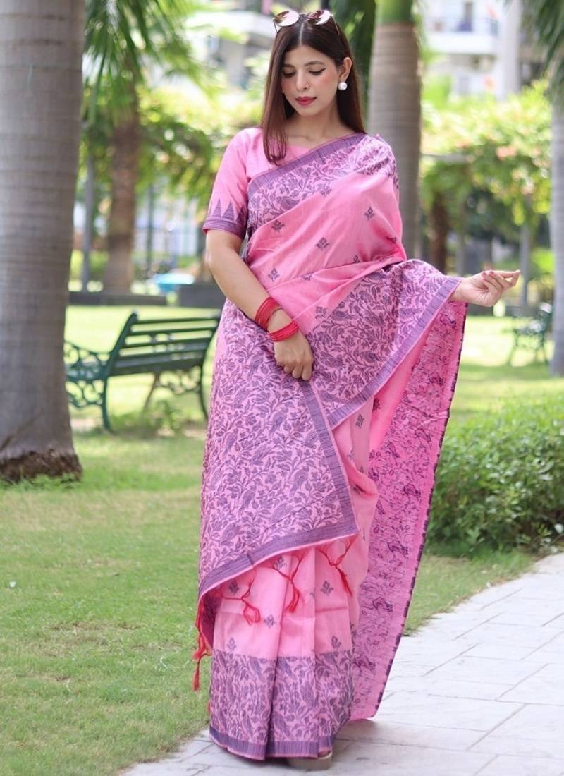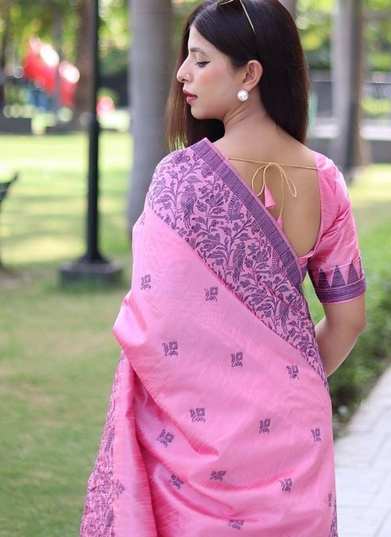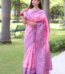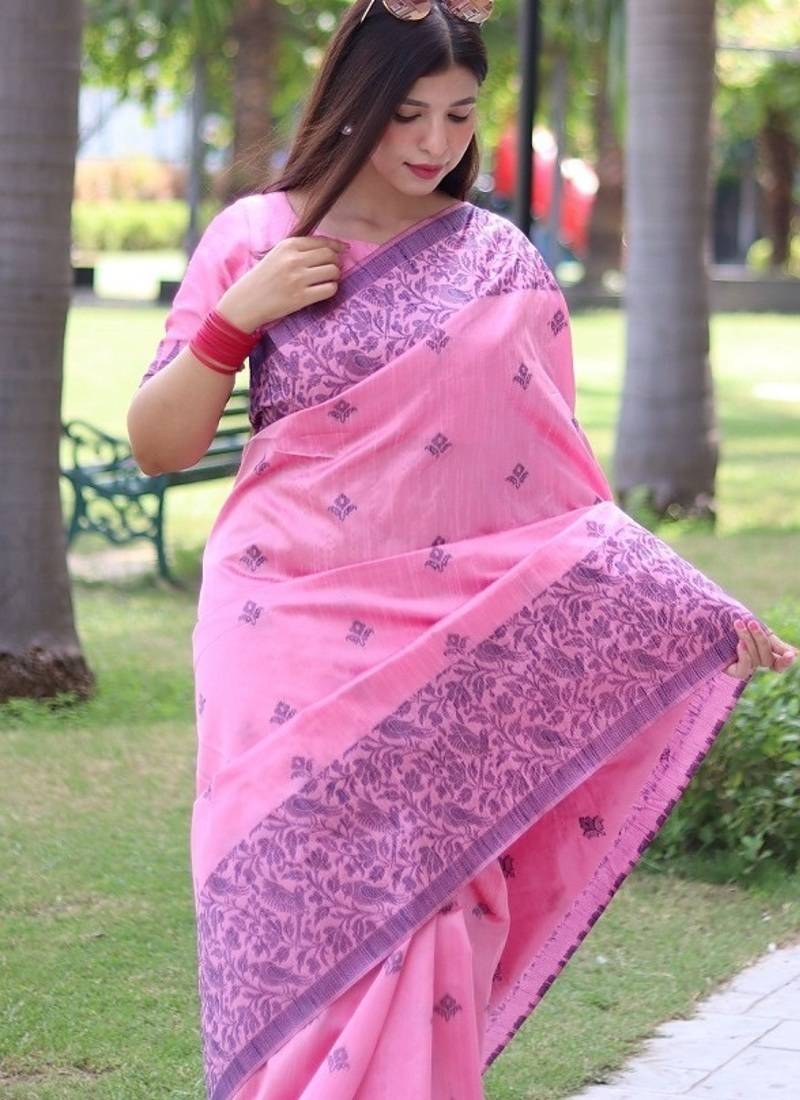 Pink color banglori handloom raw silk waving buttis saree