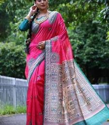 Pink color raw silk madhubani warli printed saree