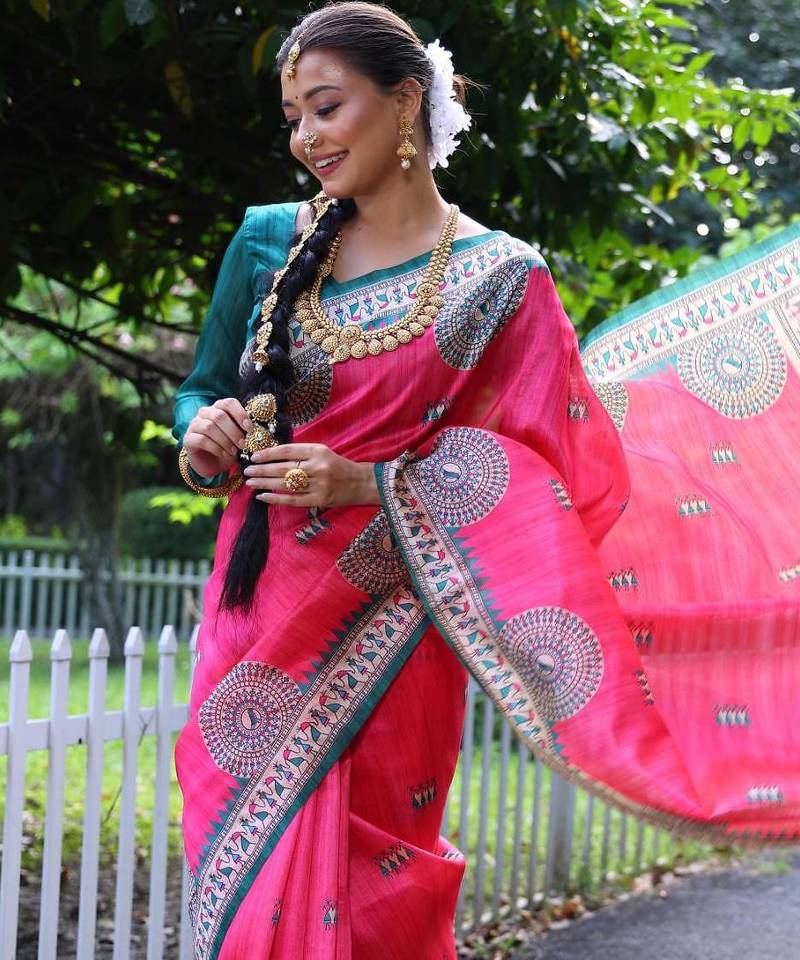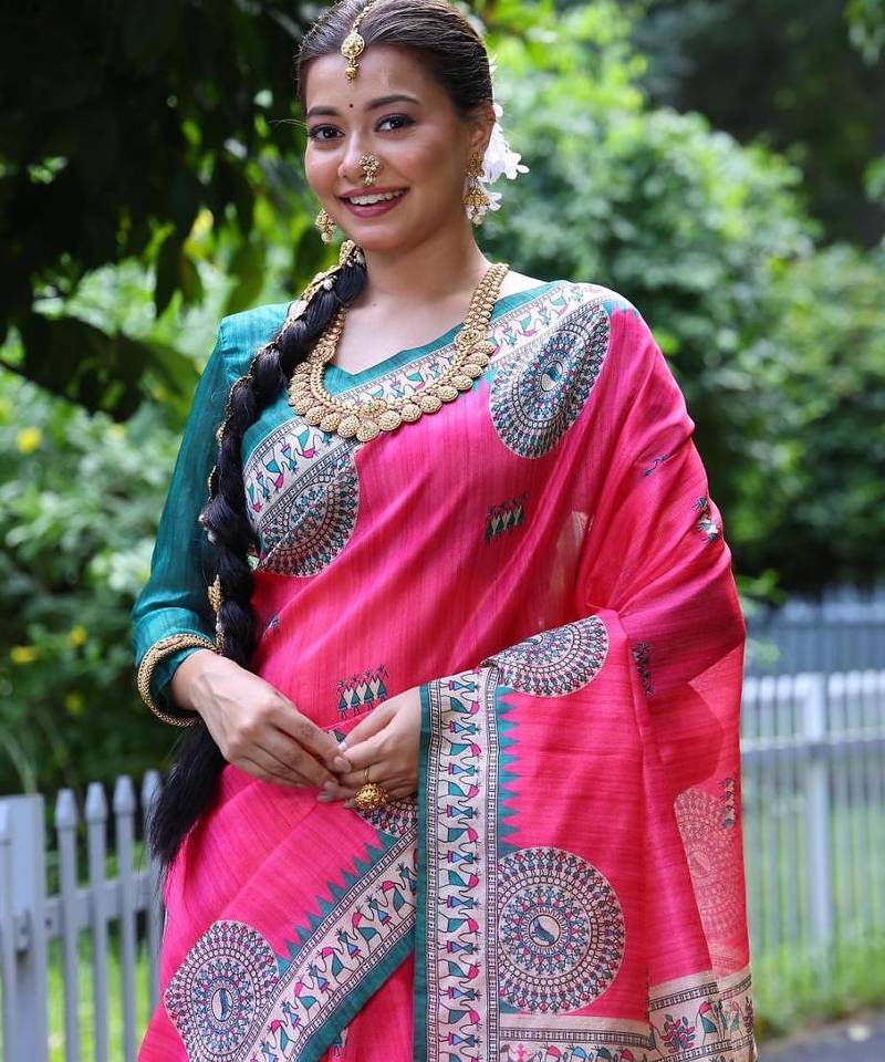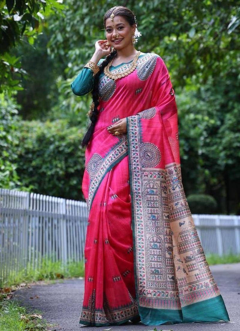 Product Name Pink Color Raw Silk Madhubani Warli Printed Saree