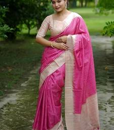 Pink color tussar silk checks printed style kanth weaving saree