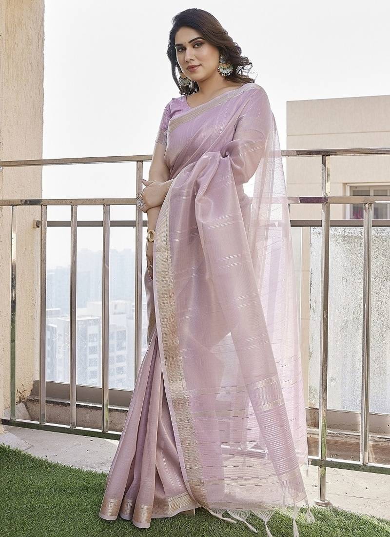 Purple color tissue linen zari weaving border saree with blouse