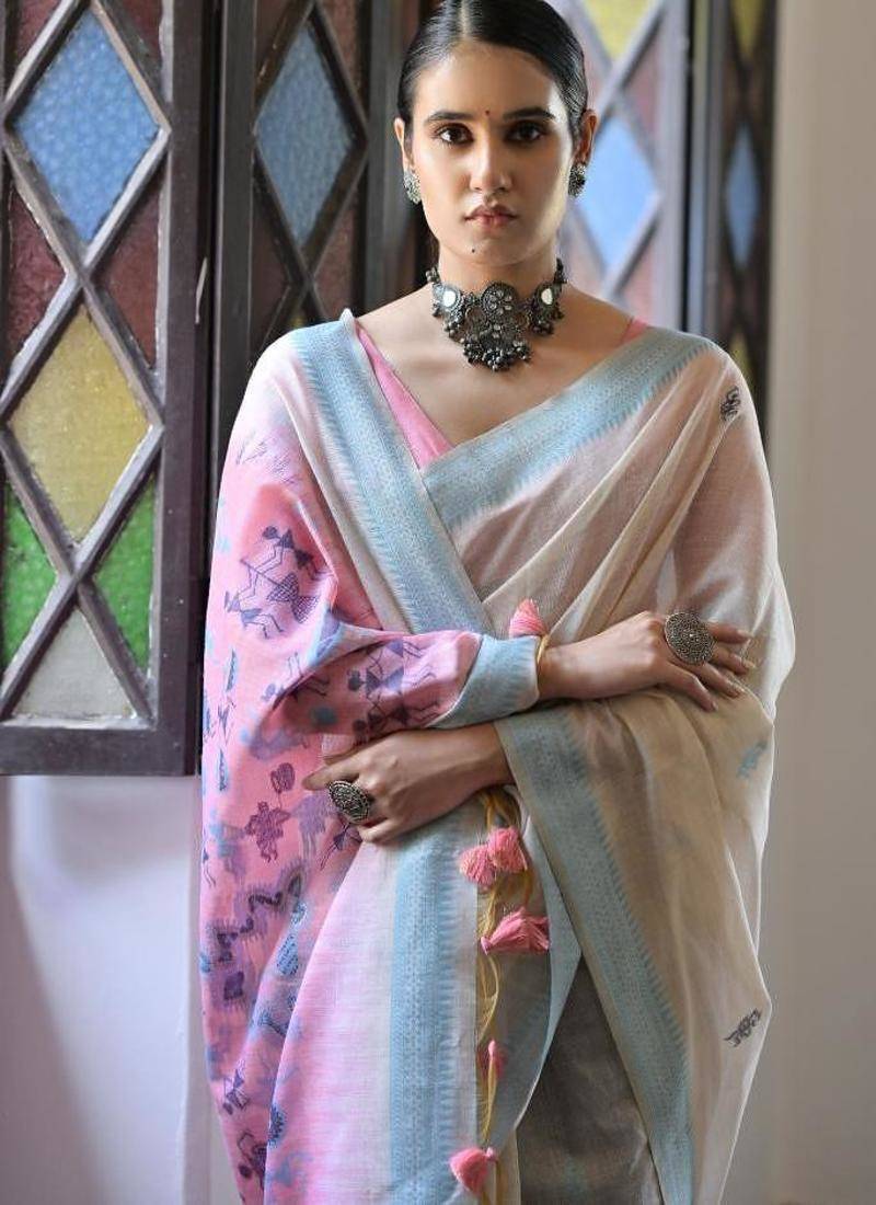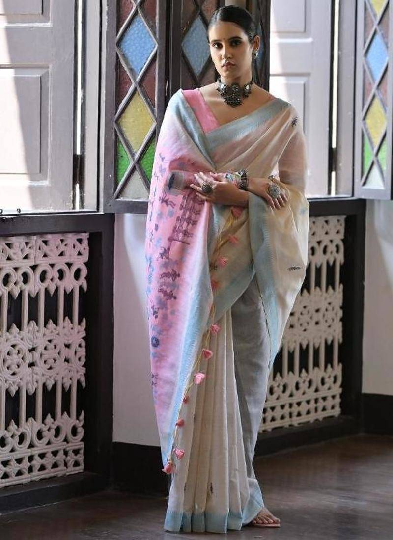 | Product Description | Premium Soft Muga Cotton Saree With Warli Type Weaving Pallu And Contrast Weaving Border With All Over Small Weaving Butties With Fancy Contrast Tassels And Contrast Blouse Piece |