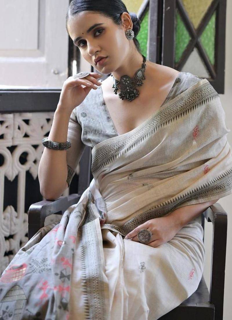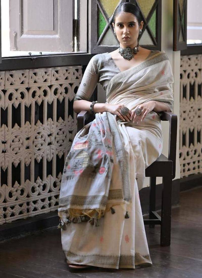 White & grey color muga cotton warli weaving pallu-border saree