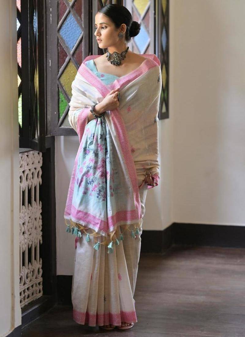 | Product Name | White & Pink Color Muga Cotton Warli Weaving Pallu Border Saree | |