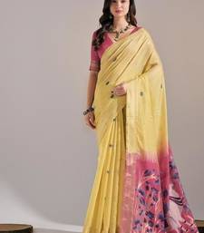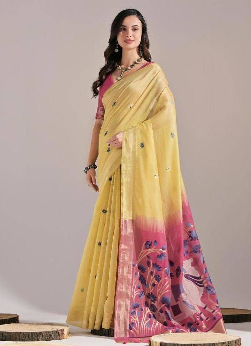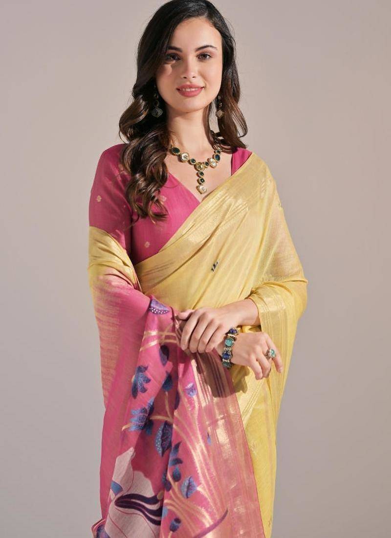 Yellow color muga cotton colorfull resham weaving saree
