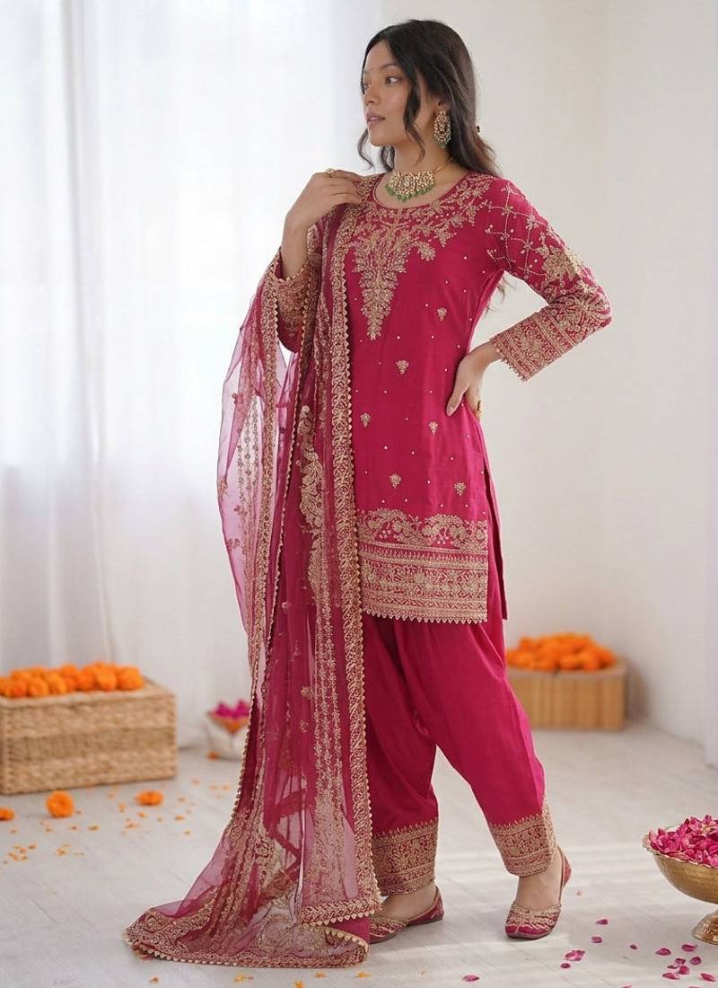 Pink crepe silk thread sequence farshi salwar suit stitched