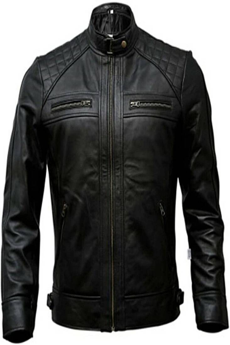 Men's black genuine lambskin leather jacket ziper & café racer quilted hand biker style